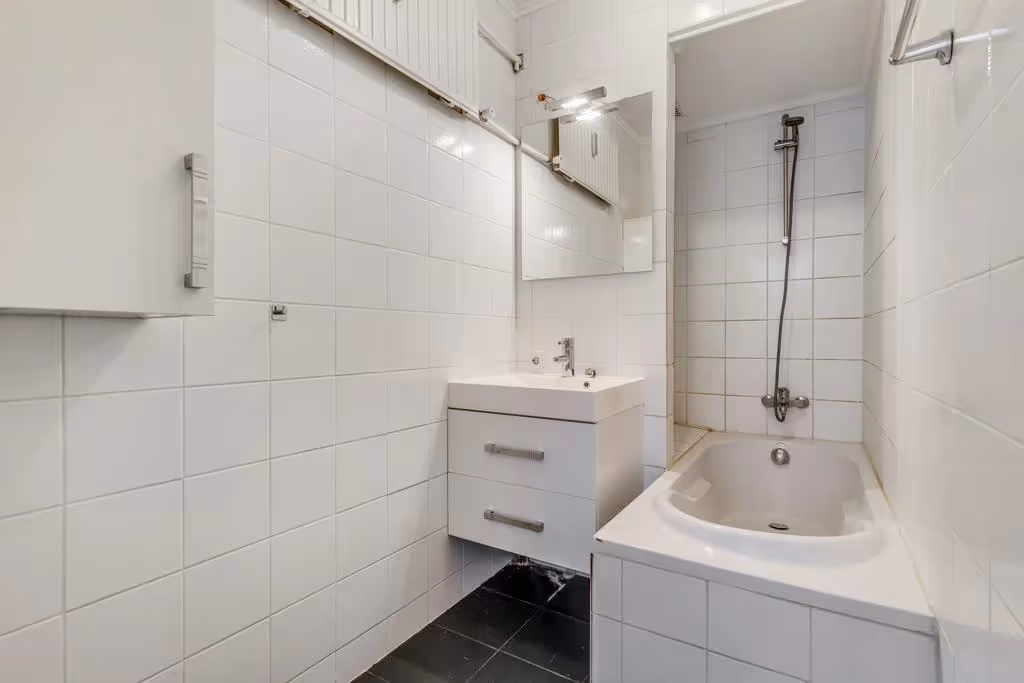 De slaapkamer van dit appartement grenst aan de zijde van de galerij en is ook mooi licht. Vanuit de slaapkamer is de badkamer te bereiken. Deze badkamer heeft een wastafel en ligbad met douchecombinatie. Tenslotte ligt in het appartement nog een apart toilet, bereikbaar via de hal.