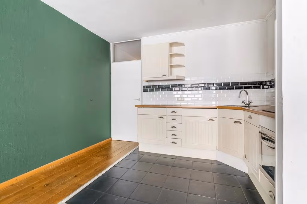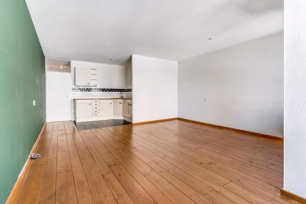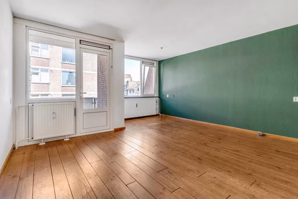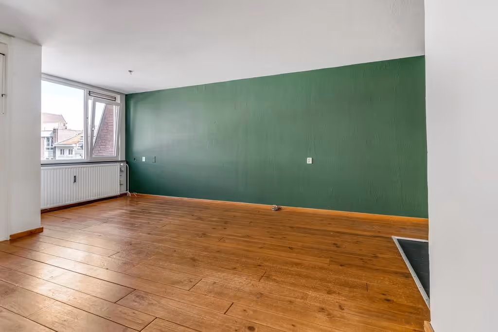 De woonkamer is verdeeld in een zit- en eethoek en door het feit dat het appartement grote kozijnen heeft, heeft het lekker veel lichtinval.