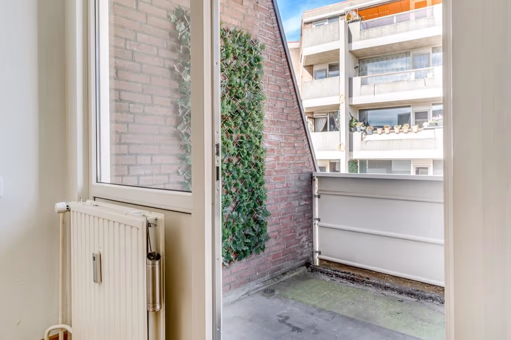 Vanuit de woonkamer is het balkon te bereiken. Deze fijne buitenruimte is voldoende ruim en kijkt mooi weg, richting de oude panden aan de singel.