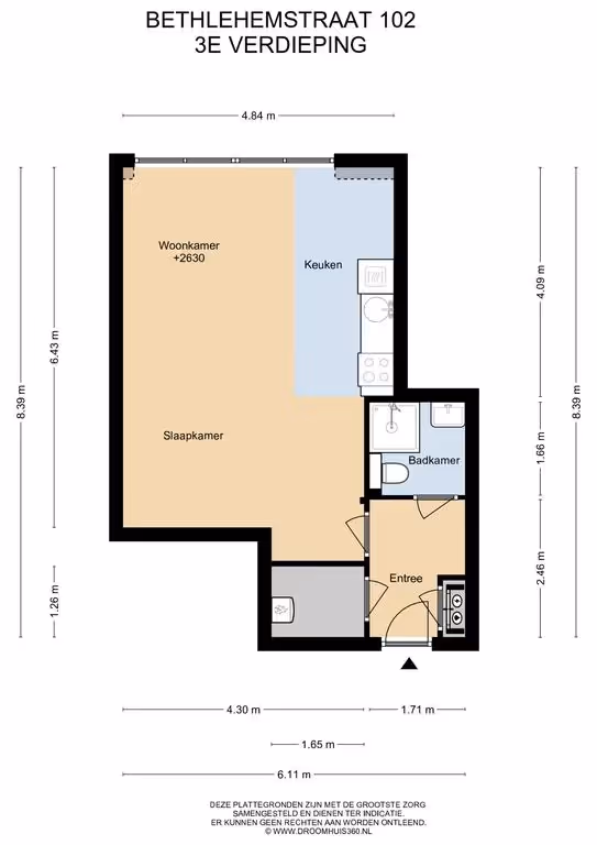Het appartement zelf ligt op de 3e verdieping. Je komt binnen in de hal met meterkast. Vanuit de hal zijn vervolgens de woonkamer / keuken met het slaapgedeelte, de badkamer en de berging te bereiken.