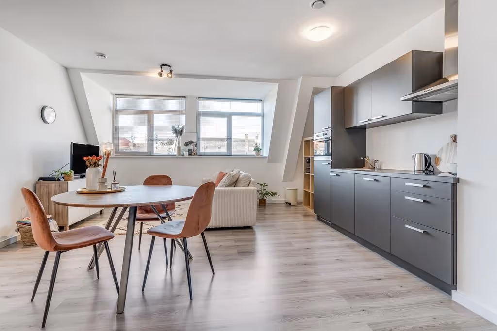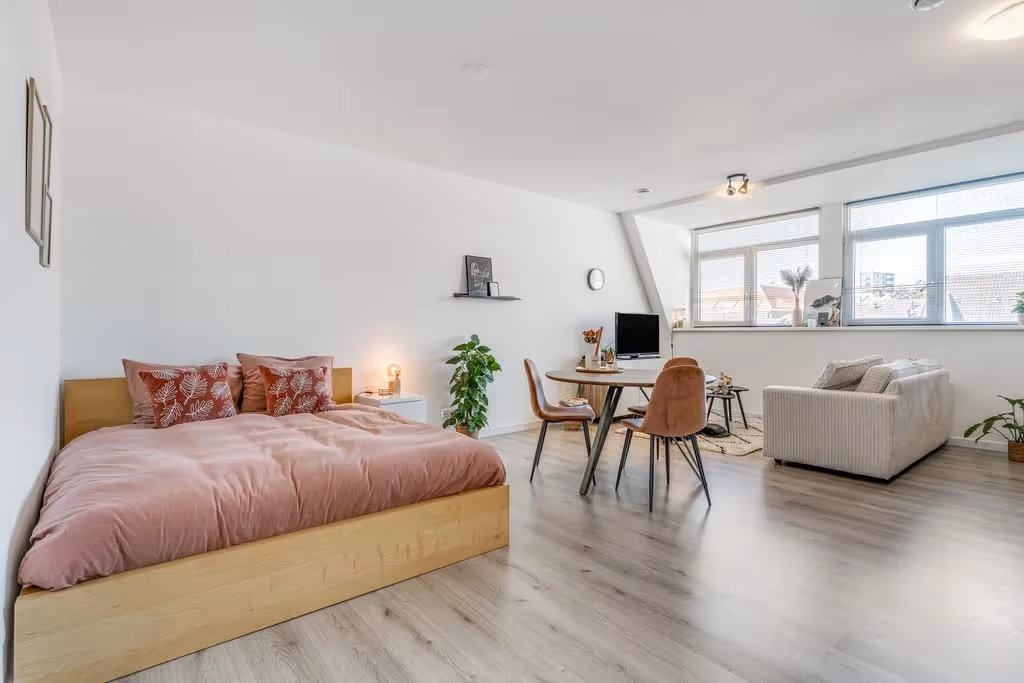 De woonkamer is verdeeld in een zit- en eethoek en door het feit dat het appartement grote kozijnen heeft, heeft het lekker veel lichtinval. Zoals aangegeven heeft het appartement geen aparte slaapkamer, maar heeft het een studio indeling met het slaapgedeelte in de leefruimte. Je kunt hier (schuif)wanden plaatsen, om dit alsnog te realiseren, maar de open plattegrond maakt dit appartement nu juist zo prettig.