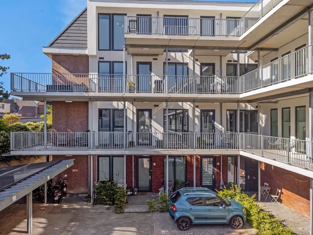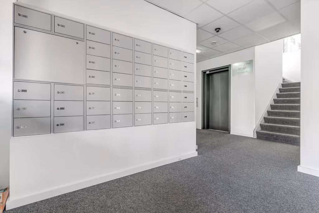 Centrale entreehal met brievenbussen en intercominstallatie. Lift en trapopgang naar de verdiepingen. Naast het gebouw ligt een overdekte fietsenstalling voor de bewoners van het complex.