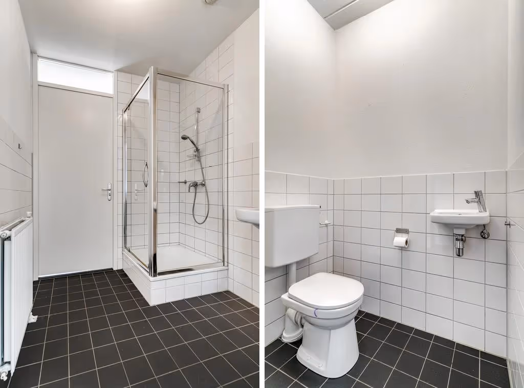 Tenslotte is vanuit de woonkamer de 2e slaapkamer te bereiken. Deze heeft eveneens een laminaatvloer en keurig niveau van afwerking. Het raam kijkt uit op de loggia. Vanuit de hal van dit appartement zijn de hoofdslaapkamer en de badkamer toegankelijk. Deze slaapkamer heeft hetzelfde niveau van afwerking als het gehele appartement, met wederom een nette wandafwerking en laminaatvloer. Deze slaapkamer heeft zicht op de galerij en de binnentuin. De badkamer tenslotte is voorzien van een wastafel en een douchecabine en staat in verbinding met de hoofdslaapkamer.