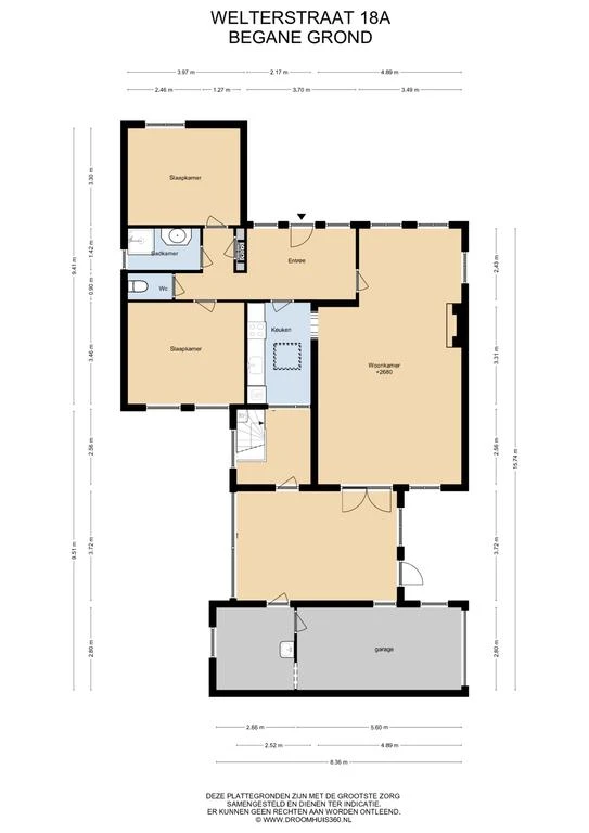Entree in de ontvangsthal met toegang naar de diverse vertrekken. Zo zijn vanuit deze hal de woonkamer, keuken, badkamer, het gastentoilet en de beide slaapkamers te bereiken. De woonkamer heeft een open haard, is ruim van opzet en heeft een mooie lichtinval door de vele raampartijen. Ook is vanuit de woonkamer de keuken bereikbaar. Deze keuken heeft een eenvoudig keukenblok, met een 4-pits kookplaat, afzuigkap en koelkast. Vanuit de keuken is een 2e hal toegankelijk, welke weer uitkomt in de serre en welke toegang biedt naar de kelder. In deze 2e hal hangt tevens de CV combiketel (Nefit, 2021, eigendom). Vanuit de entreehal zijn voorts de beide slaapkamers, de badkamer en het gastentoilet te bereiken. Beide slaapkamers hebben kozijnen met dubbele beglazing (de rest van de bungalow beschikt over enkel glas). De badkamer is compact en heeft een douchecabine en wastafelmeubel. Zoals aangegeven is vanuit de keuken de serre bereikbaar, welke op zijn beurt weer toegang geeft tot de garage.