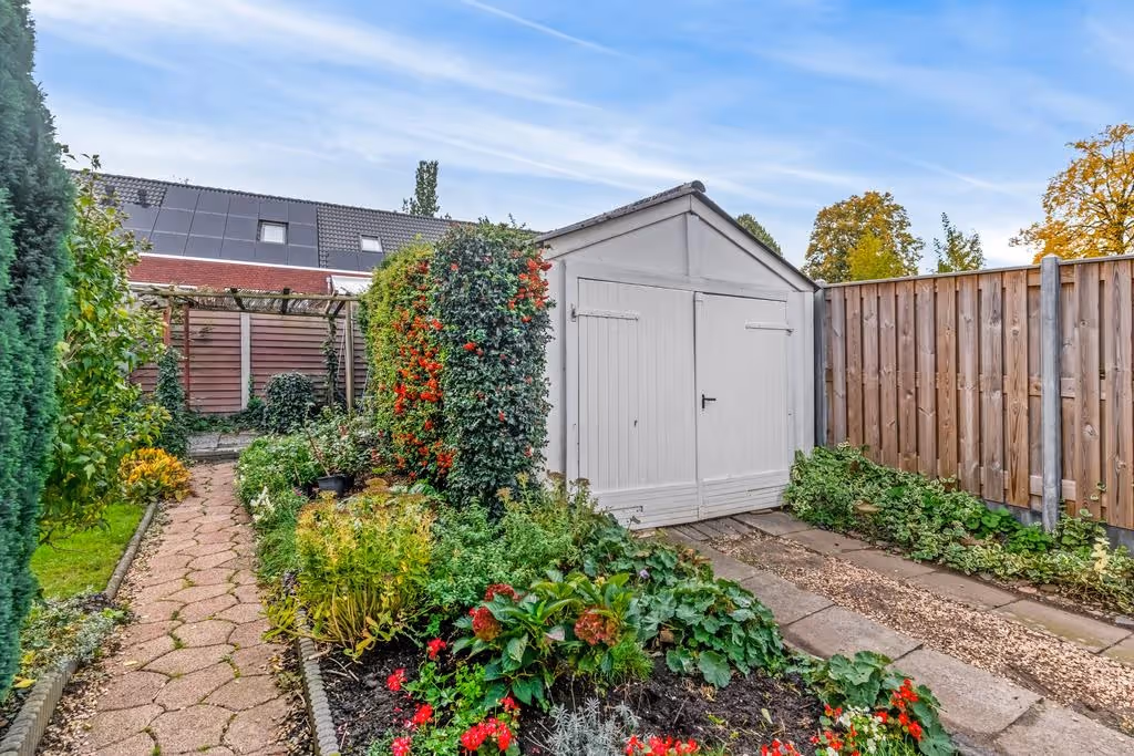 Deze fijne woning heeft ook een ruime tuin, welke is aangelegd met een overdekt terras met sierbestrating, veel beplanting en een gazon. Deze tuin ligt op het Zuid Westen en beschikt naast de eerder omschreven berging, ook een vrijstaand stenen garage / schuur. Tenslotte beschikt de woning nog over een diepe oprit, waar je meerdere auto’s kunt parkeren.