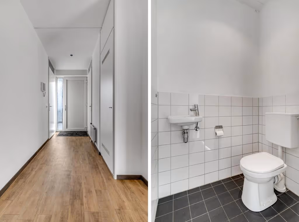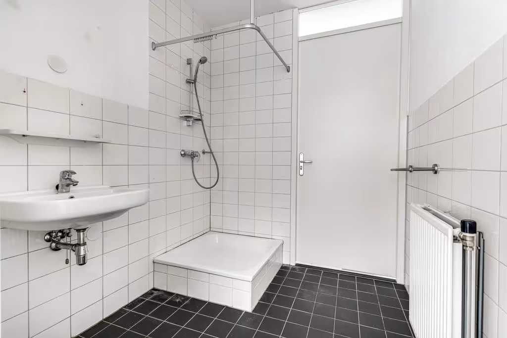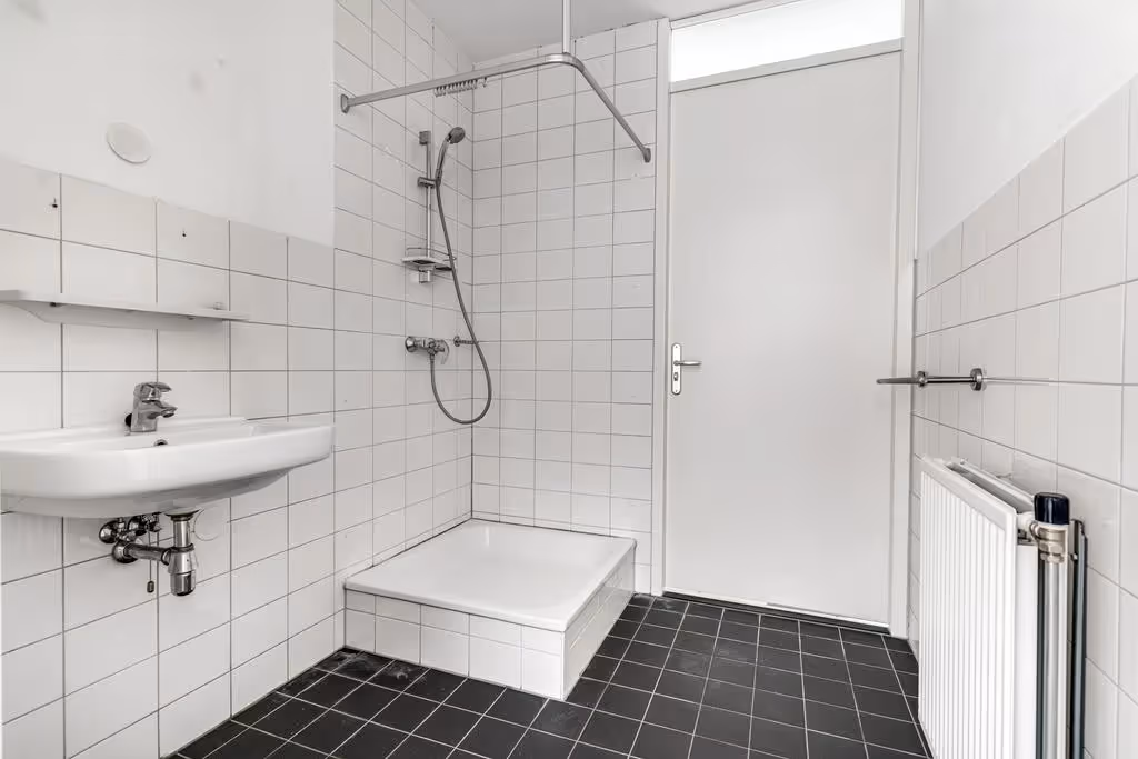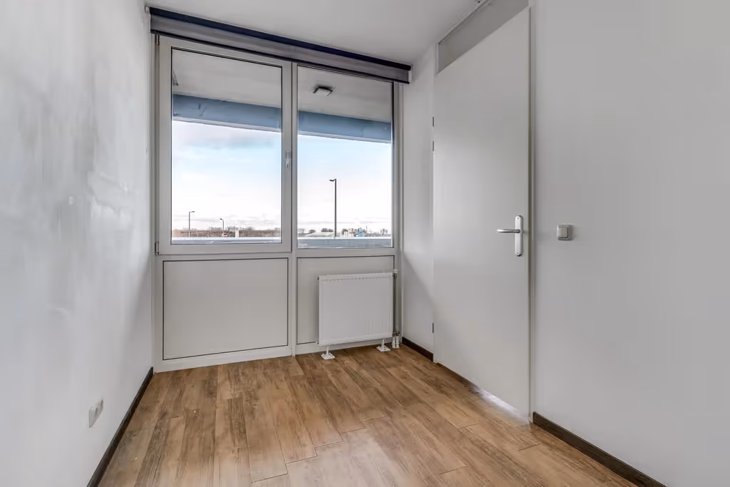 Tenslotte is vanuit de woonkamer de 2e slaapkamer te bereiken. Deze heeft eveneens een laminaatvloer en keurig niveau van afwerking. Het raam kijkt uit op de loggia. Vanuit de hal van dit appartement zijn de hoofdslaapkamer en de badkamer toegankelijk. Deze slaapkamer heeft hetzelfde niveau van afwerking als het gehele appartement, met wederom een nette wandafwerking en laminaatvloer. Deze slaapkamer heeft zicht op de galerij en de binnentuin. De badkamer tenslotte is voorzien van een wastafel en een douchecabine en staat in verbinding met de hoofdslaapkamer.