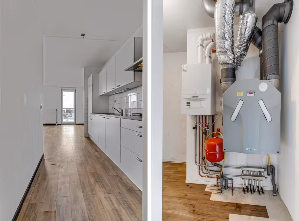 Het appartement is gelegen op de 1e verdieping van dit woonblok. Entree in de hal met meterkast en toegang tot de diverse vertrekken. Ook ligt in de hal het toilet met fonteintje. De woonkamer is heerlijk licht en heeft een prima niveau van afwerking, met onder andere een nette laminaatvloer. De keuken staat in open verbinding met de woonkamer en deze keuken heeft een opstelling met de volgende inbouwapparatuur; een 4-pits gasfornuis, afzuigkap, koelkast en vaatwasser. Vervolgens is vanuit de keuken de bijkeuken / technische ruimte bereikbaar. Hier bevinden zich de aansluitpunten voor het witgoed, veel extra bergruimte en de CV combiketel (Vaillant, eigendom, bouwjaar 2010) en WTW unit (warmte-terugwin unit). Vanuit de woonkamer is ook de loggia te bereiken. Deze fijne buitenruimte is gelegen op het Noord Westen, waardoor u geniet van de avondzon. Verder heeft deze loggia zicht over het Outlet Centre.