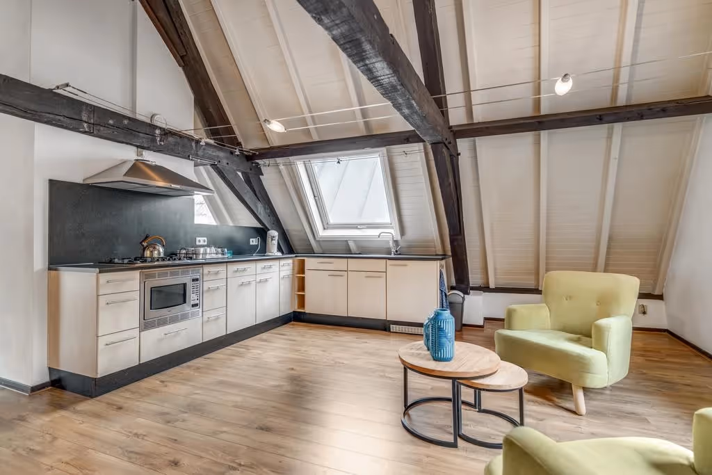 Het appartement is gelegen op de bovenste verdieping van dit statige Rijksmonument. Via de entreehal zijn de diverse kamers te bereiken. De riante woonkamer is één en al sfeer en charme, met een hoge nok met authentieke balken, de sfeervolle open haard en de mooie lichtinval door de vele dakramen. Tevens is hier de keuken gelegen, welke praktisch in de ruimte is geplaatst, in een hoekopstelling. De keuken bevat de volgende inbouwapparatuur: een gasfornuis, afzuigkap, magnetron en koelkast. Tevens is het balkon aan de achterzijde bereikbaar vanuit de woonkamer. Vanuit de hal in het appartement zijn achtereenvolgens de berging, een bergkast met CV combiketel, de badkamer, het toilet en de 2 slaapkamers te bereiken. De berging zit in de dakschuinte en de CV combiketel dient vervangen te worden. De badkamer bestaat uit een ligbad met douchecombinatie, een dubbele wastafel en hier bevinden zich de aansluitpunten voor het witgoed. Het toilet ligt naast de badkamer. De beide slaapkamers liggen aan de achterzijde van het appartement en zijn respectievelijk 15 m² en 7 m² groot.