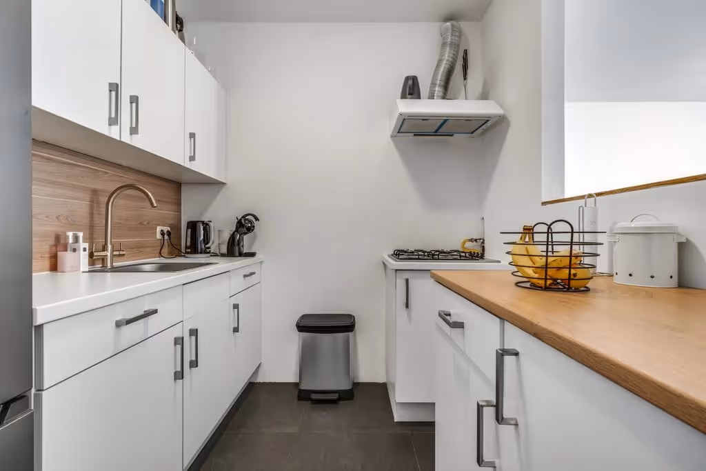Verder heeft het appartement een nette keuken, met als inbouwapparatuur een 4-pits gasfornuis en afzuigkap.