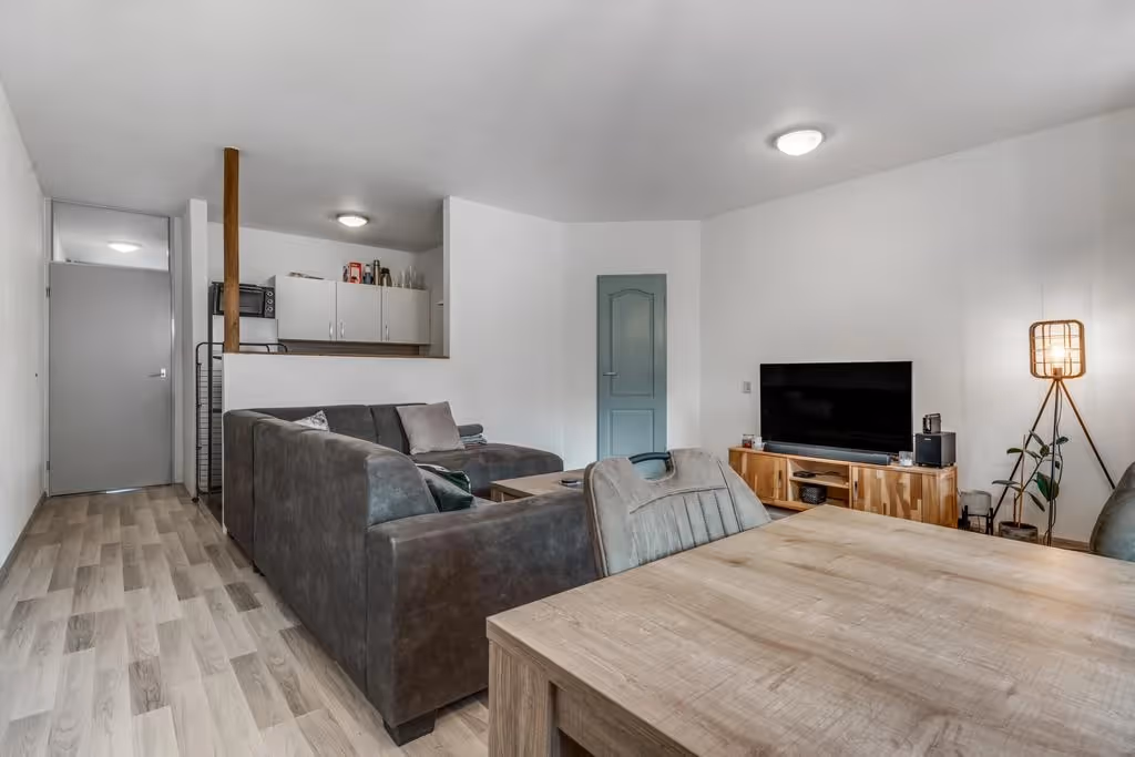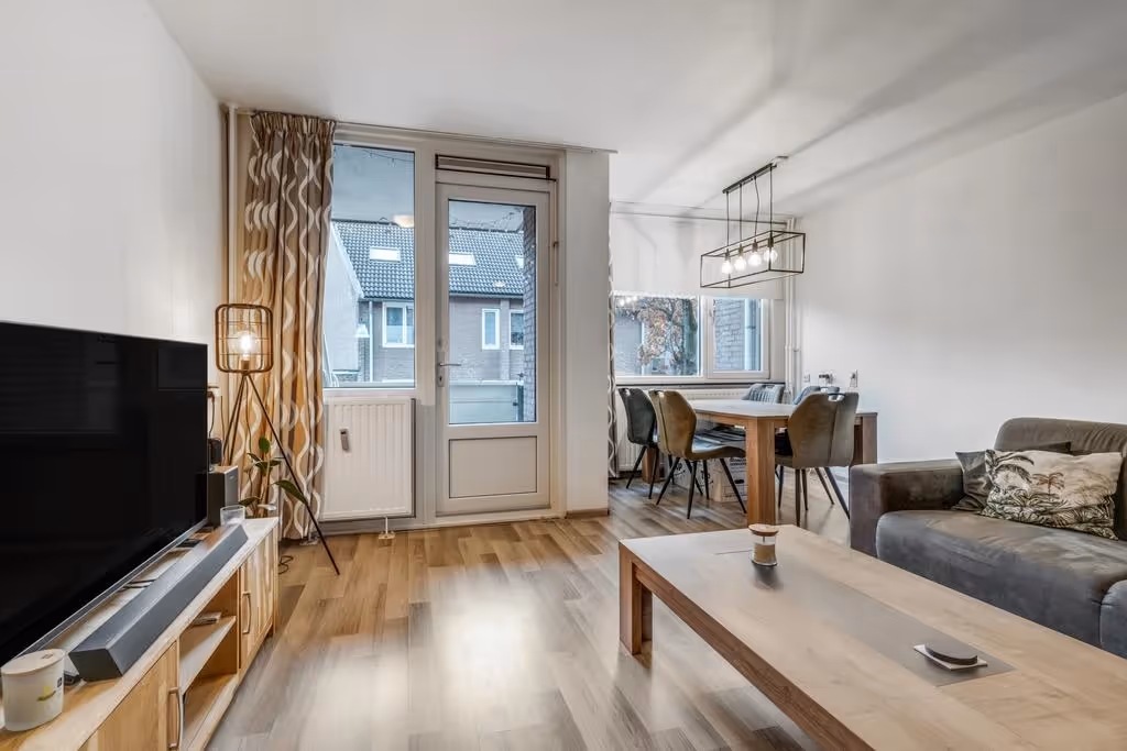 De woonkamer is verdeeld in een zit- en eethoek en door het feit dat het appartement grote kozijnen heeft, heeft het lekker veel lichtinval.