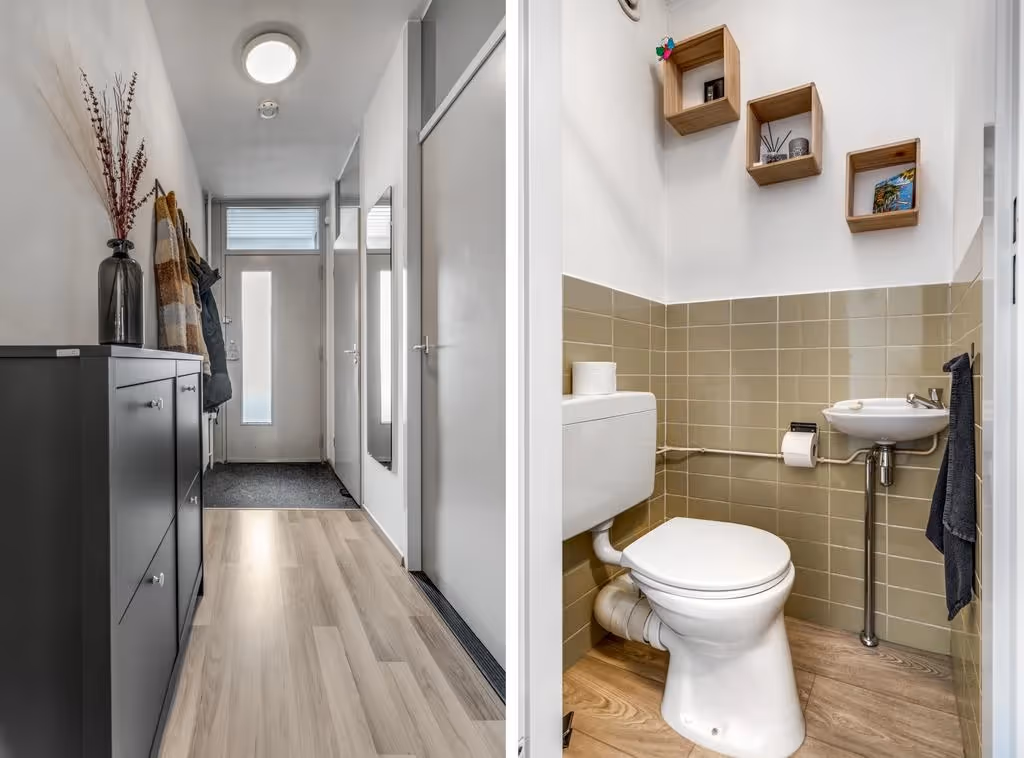 Het appartement zelf ligt op de 1e verdieping. Je komt binnen in de hal en die geeft toegang tot diverse kamers.