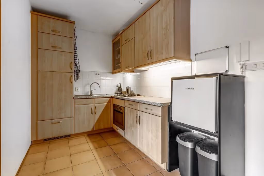 Verder heeft het appartement een prima keuken, met als inbouwapparatuur een 4-pits gasfornuis, afzuigkap, koelkast en oven.
