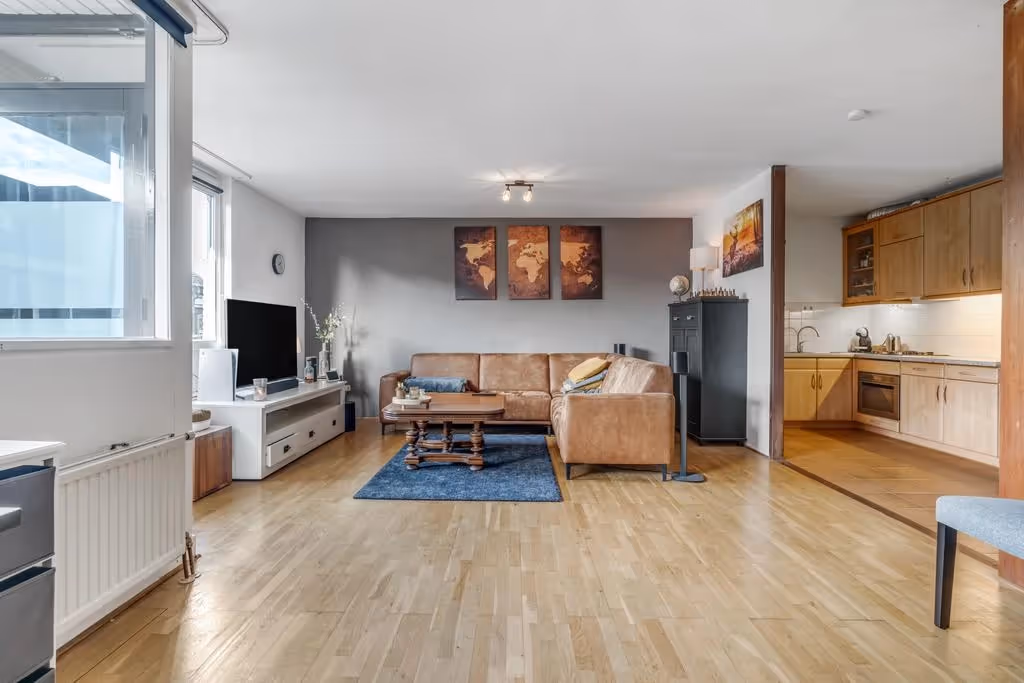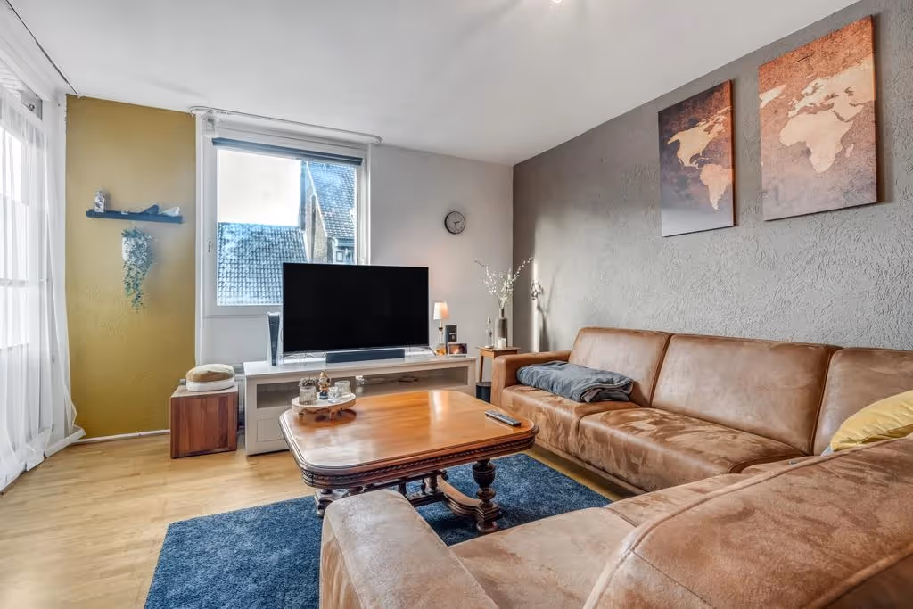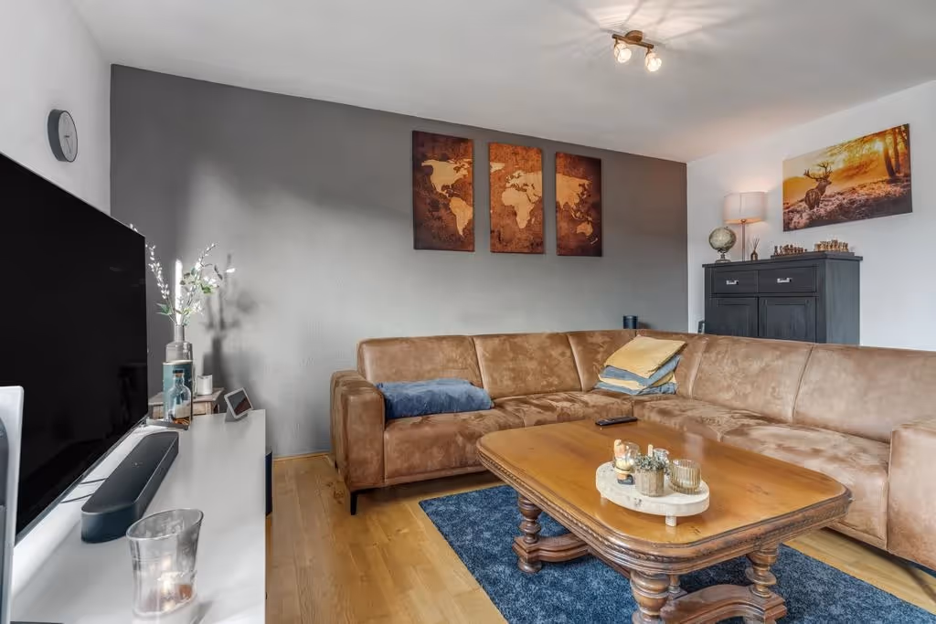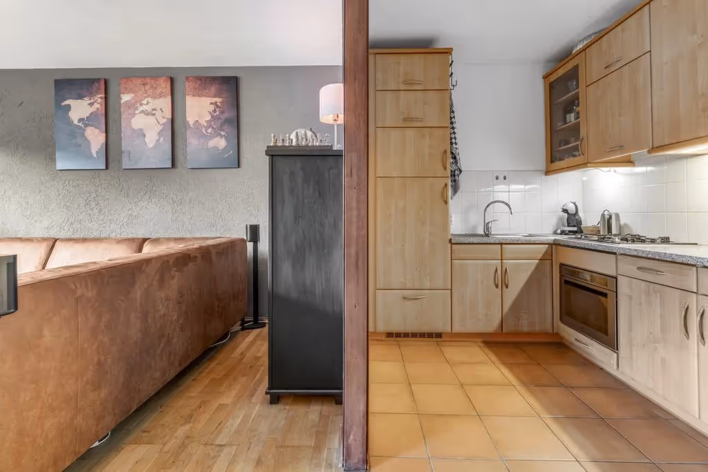 De woonkamer is verdeeld in een zit- en eethoek en door het feit dat het appartement grote kozijnen heeft, heeft het lekker veel lichtinval.