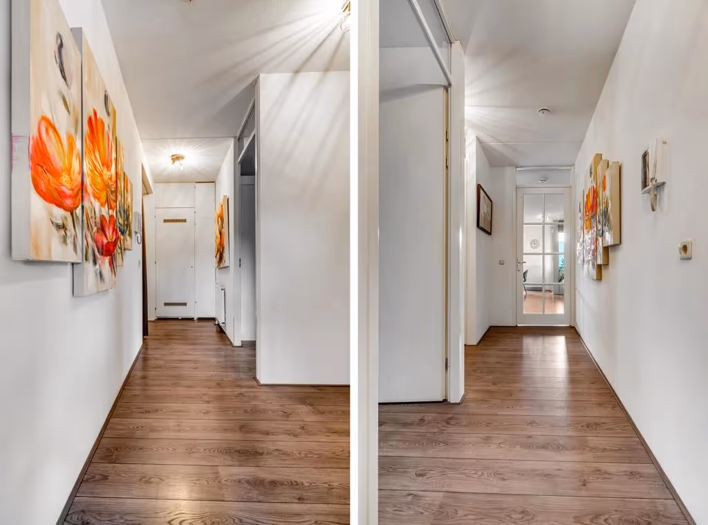 Het appartement is gelegen op de 1e woonlaag van dit complex. Entree in de hal met meterkast en toegang tot de diverse vertrekken. Ook ligt in de hal het gastentoilet met fonteintje. De woonkamer is heerlijk licht en heeft een prima niveau van afwerking, met onder andere een nette laminaatvloer. De luxe keuken staat in open verbinding met de woonkamer en deze keuken heeft een opstelling met de volgende inbouwapparatuur; een 4-pits inductiekookplaat, afzuigkap en vaatwasser. De Koelkast is los. Vervolgens is vanuit de keuken de bijkeuken / technische ruimte bereikbaar. Hier bevinden zich de aansluitpunten voor het witgoed, veel extra bergruimte en de CV combiketel (Vaillant, eigendom, bouwjaar 2010) en WTW unit (warmte-terugwin unit). Vanuit de woonkamer is ook de loggia te bereiken. Deze fijne buitenruimte is gelegen op het Noord Westen, waardoor u geniet van de avondzon. Verder heeft deze loggia zicht richting het Outlet Centre.