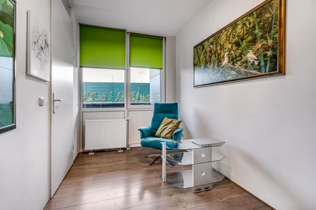 Tenslotte is vanuit de woonkamer de 2e slaapkamer te bereiken. Deze heeft eveneens een laminaatvloer en keurig niveau van afwerking. Het raam kijkt uit op de loggia. Vanuit de hal van dit appartement zijn de hoofdslaapkamer en de badkamer toegankelijk. Deze slaapkamer heeft hetzelfde niveau van afwerking als het gehele appartement, met wederom een nette wandafwerking en laminaatvloer. De badkamer tenslotte is voorzien van een wastafel en een douchecabine en is keurig onderhouden.