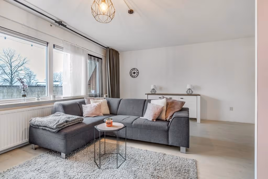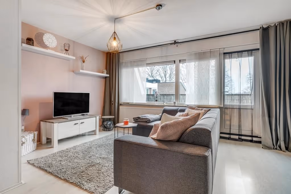 De woonkamer is sfeervol en door het feit dat het appartement grote kozijnen heeft, heeft het lekker veel lichtinval.