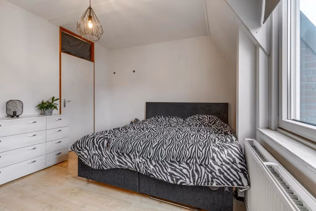 De slaapkamer en badkamer van dit appartement zijn ook vanuit de hal te bereiken. Deze slaapkamer is lekker ruim en biedt voldoende plaats aan een groot bed en kasten. De badkamer bestaat uit een ligbad / douche combinatie en een wastafel. Ook is op de badkamer de aansluiting voor de wasmachine aanwezig. Tenslotte liggen in het appartement nog een toilet en 2 bergkasten, waarvan 1 de CV combiketel bevat (AWB, eigendom)