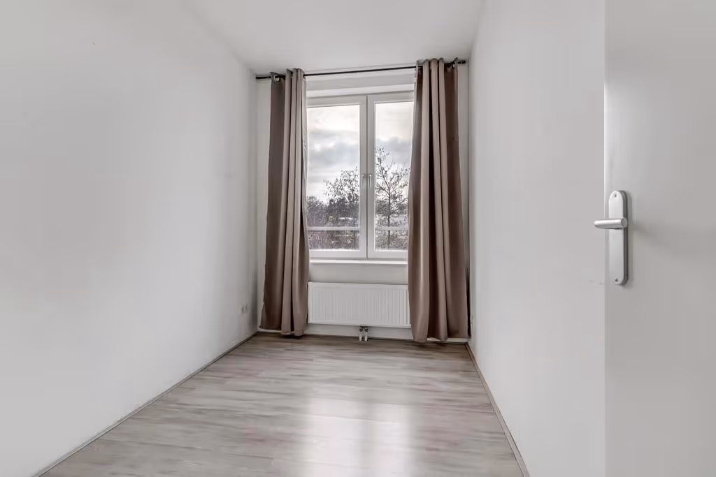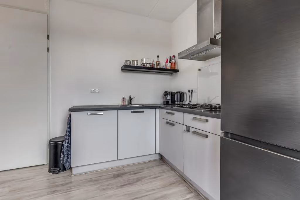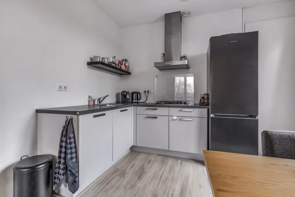 De lichte woonkamer is verdeeld in een zit- en eethoek en door het feit dat het appartement aan 2 zijden ramen heeft, heeft het lekker veel lichtinval. De open keuken heeft een keukenblok in hoekopstelling en de volgende inbouwapparatuur: een 4-pits gasfornuis en een afzuigkap. Het hele appartement heeft een keurig niveau van afwerking, met onder andere een nette laminaatvloer. Naast de keuken ligt een berging. Deze berging is ruim en herbergt de aansluitpunten voor het witgoed.