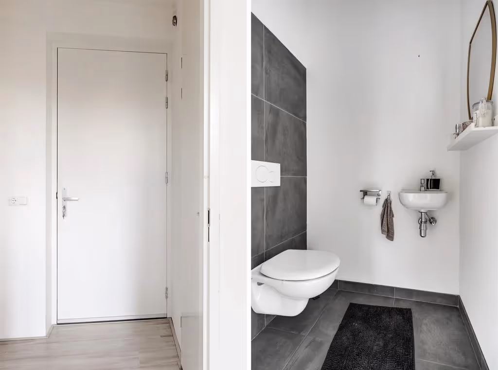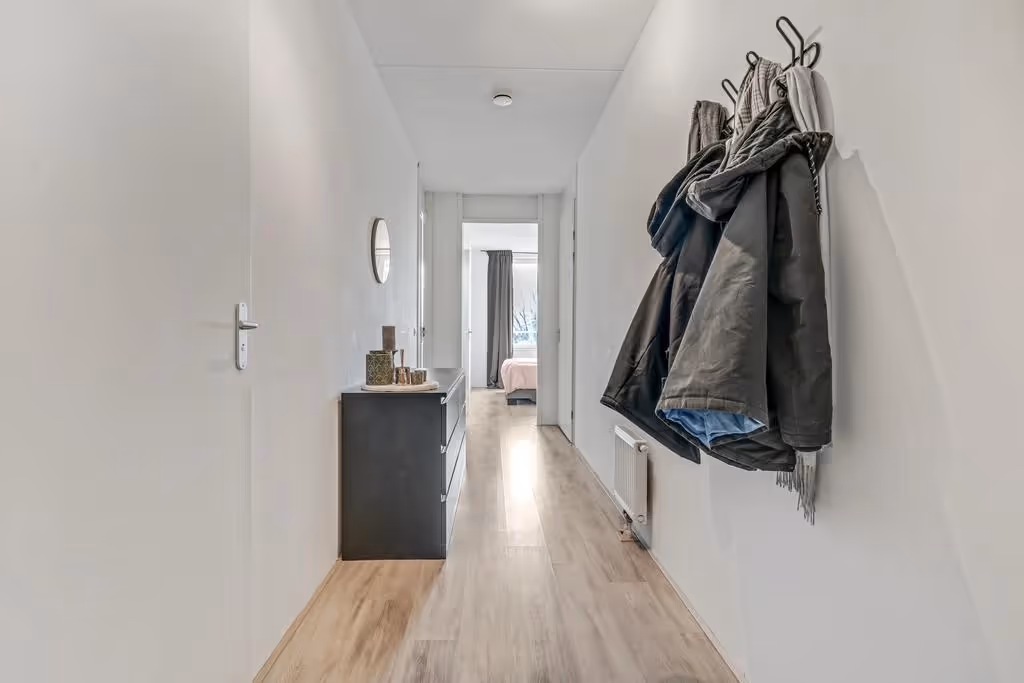 De entree van dit fijne appartement ligt op de 2e verdieping. Je komt binnen in de hal en die geeft toegang tot de diverse kamers.