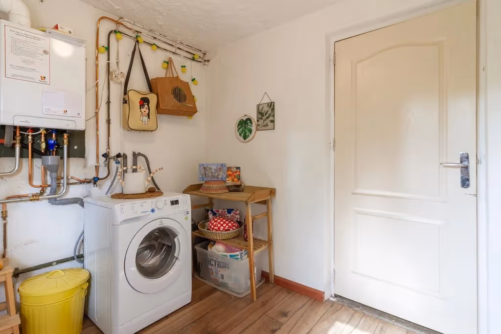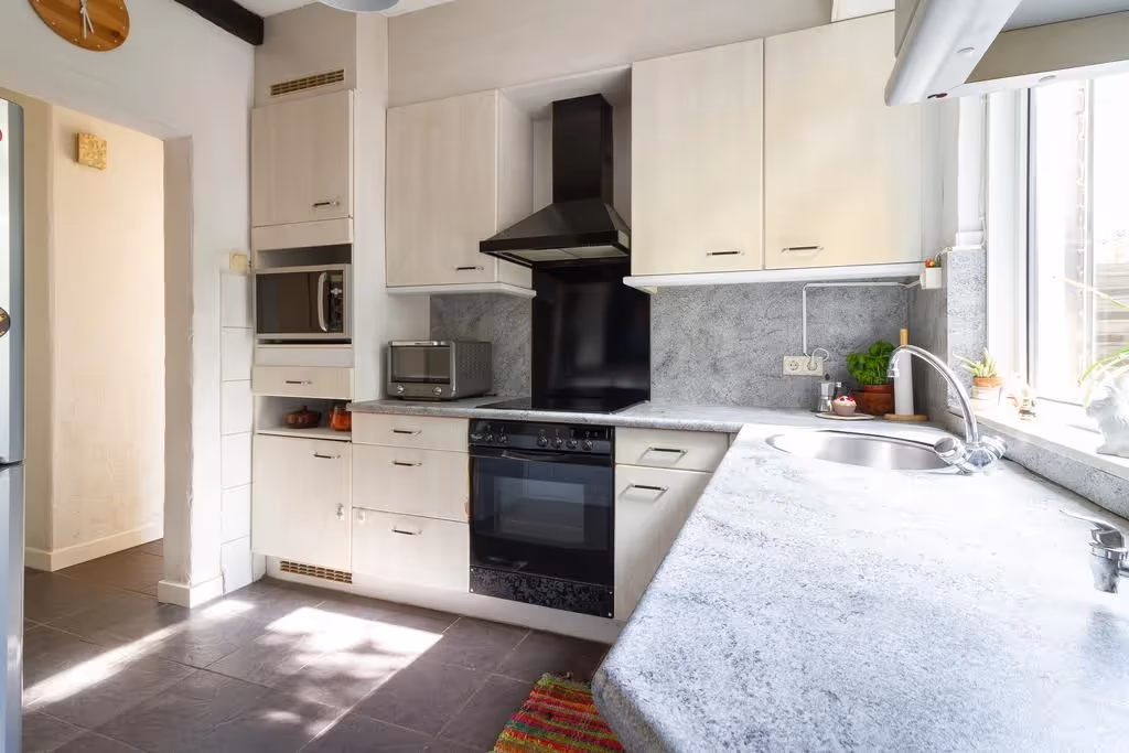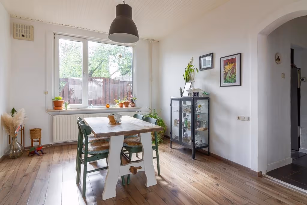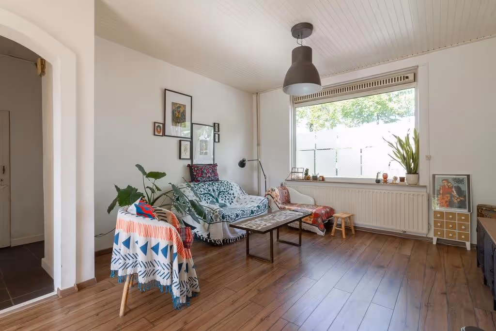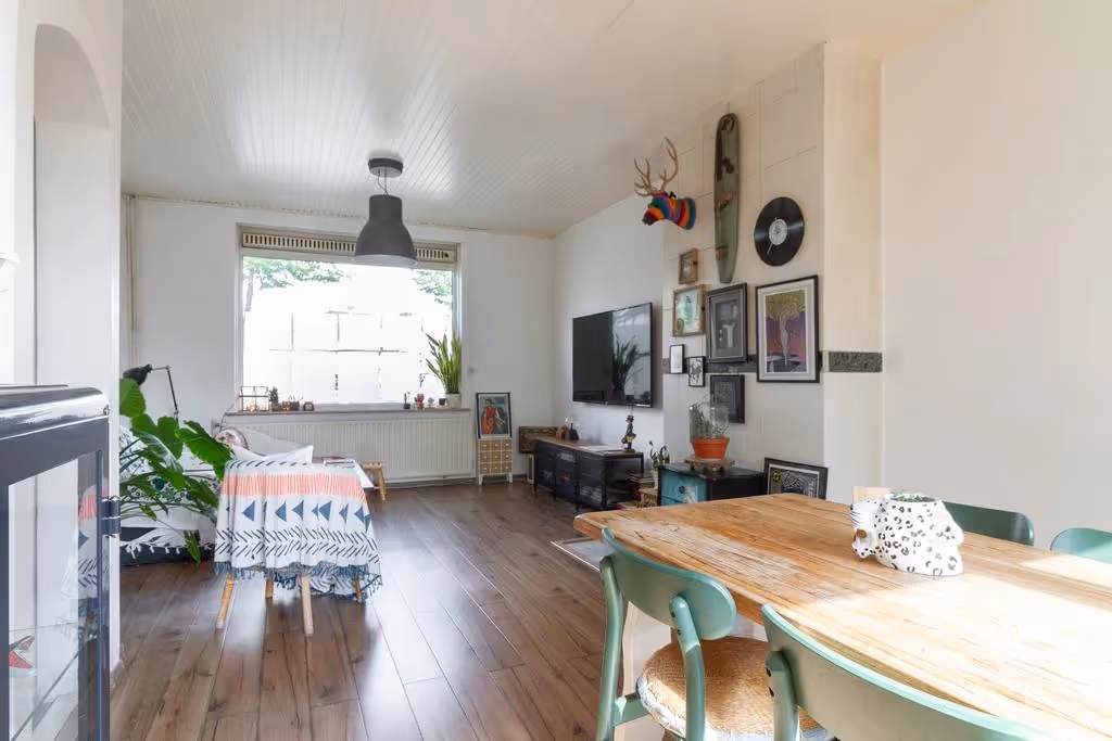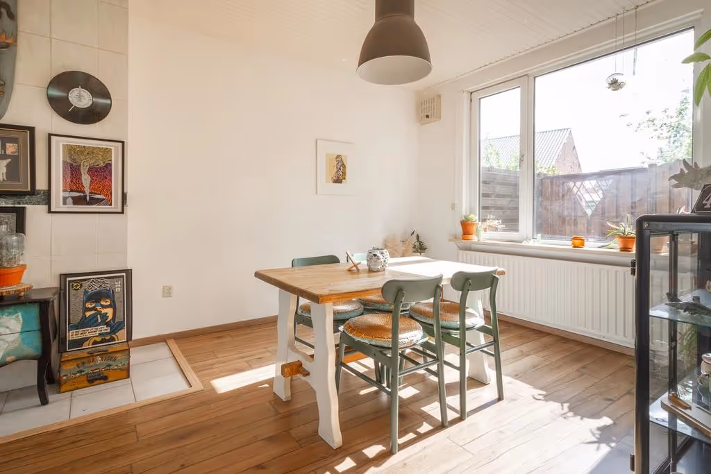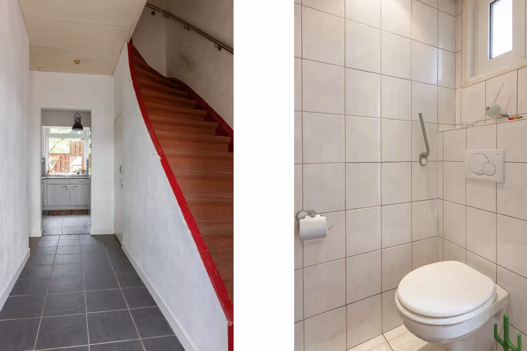 Entree in de hal met met meterkast en toegang tot de keuken en de woonkamer. In deze woonkamer heb je een mooie lichtinval door de riante raampartijen. Verder heeft deze sfeervolle woonkamer een laminaatvloer. De keuken ligt ernaast en heeft een hoekopstelling. Deze keuken beschikt over inbouwapparatuur, waaronder een kookplaat, oven en afzuigkap, maar de keuken verdient ook een upgrade. Vanuit de keuken is vervolgens de bijkeuken te bereiken, waar zowel de CV combiketel hangt (Intergas, huur, 2022), als de aansluitpunten voor het witgoed zich bevinden. Vanuit de bijkeuken zijn vervolgens nog het gastentoilet en de inpandige garage te bereiken. Deze inpandige garage heeft een elektrische sectionaalpoort.