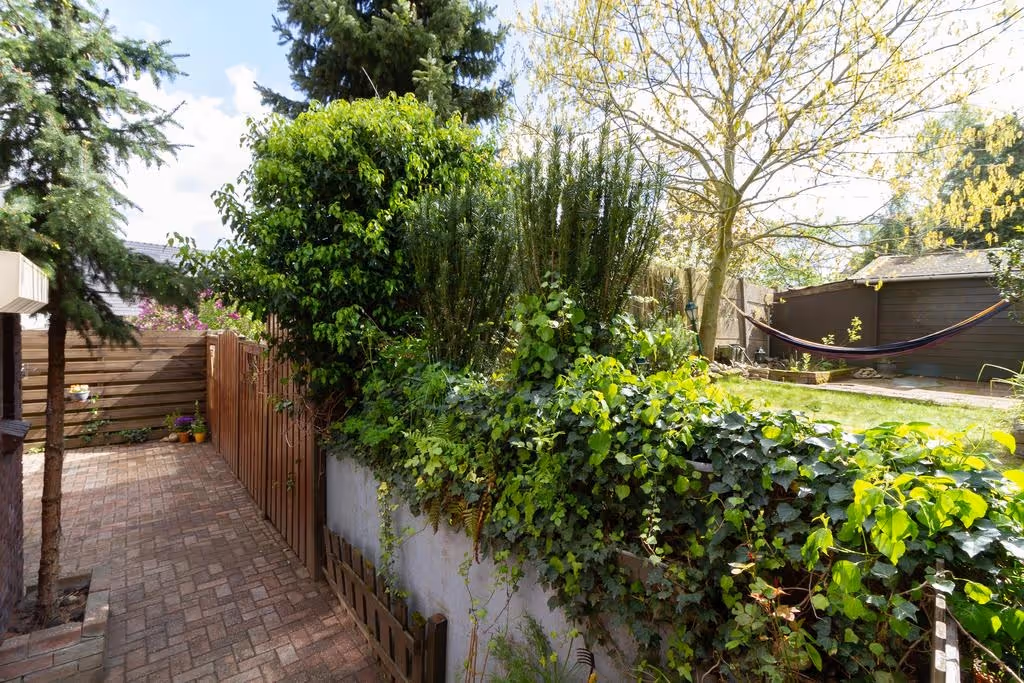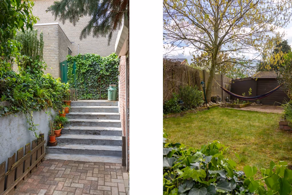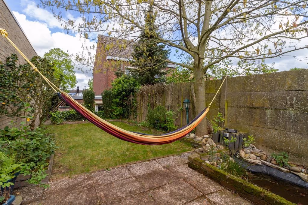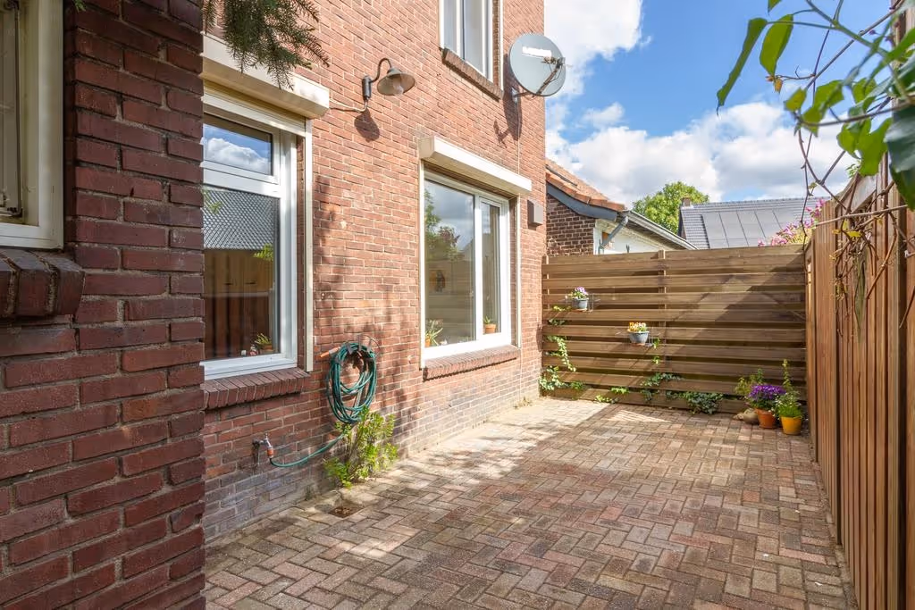 Deze woning heeft ook nog eens een speelse tuin, welke keurig is aangelegd en elke eigenlijk uit 2 delen bestaat. Achter de woning ligt een terras met sierbestrating en “om het hoekje” ligt de rest van de tuin, bestaande uit een gazon en beplanting. De tuin heeft lekker veel privacy en is gelegen op het Zuid Oosten.