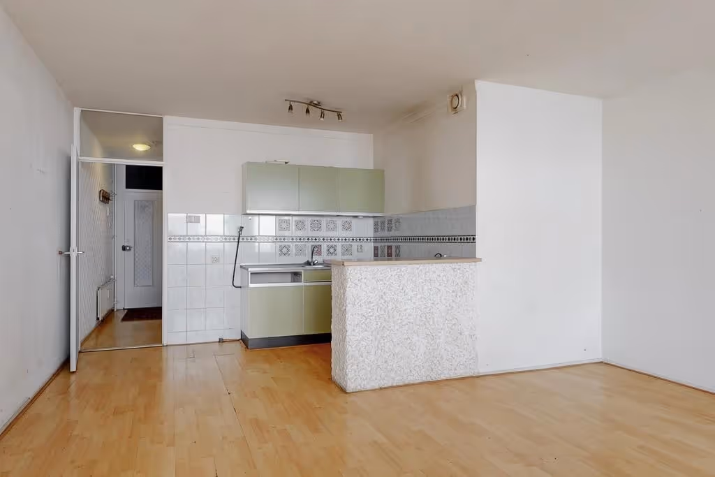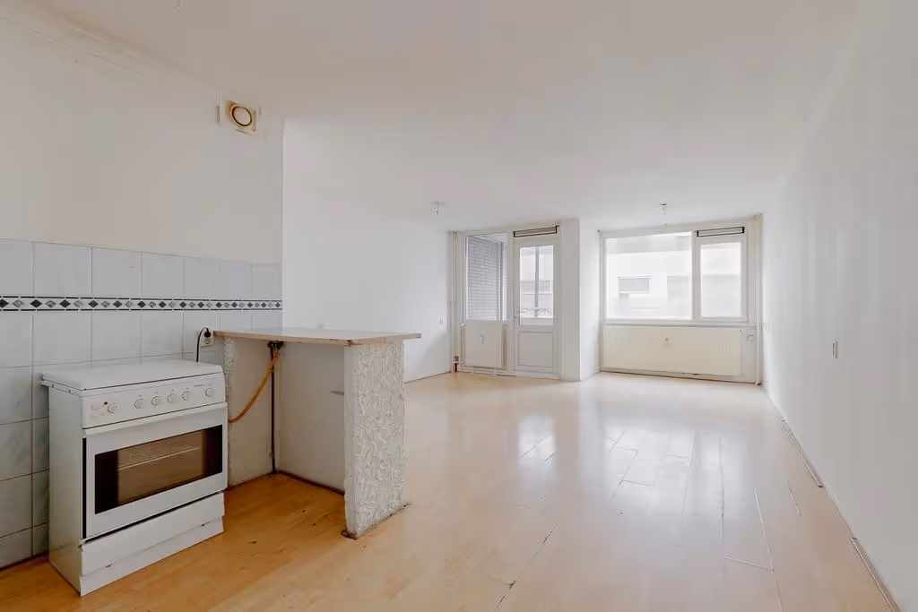 Verder heeft het appartement een gedateerde keuken, zonder inbouwapparatuur en met een los gasfornuis / oven.