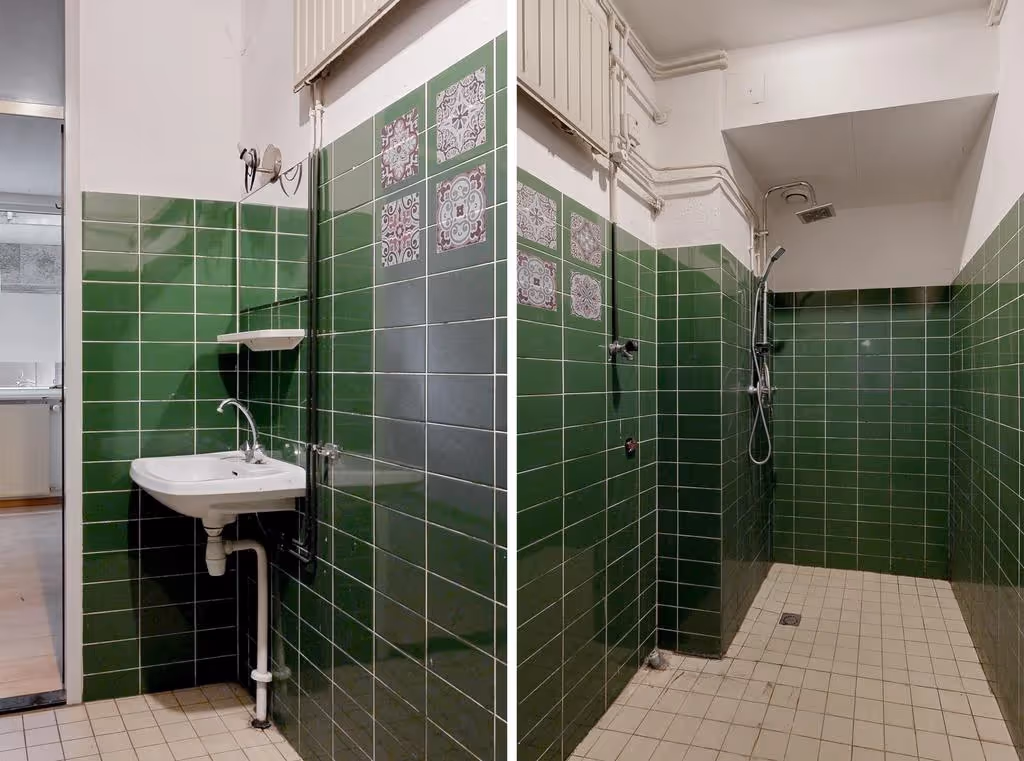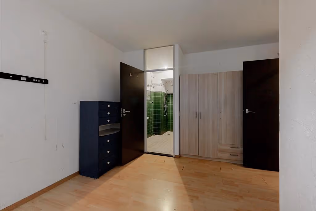 De slaapkamer van dit appartement grenst aan de zijde van de entree en is lekker ruim. Vanuit de slaapkamer is de badkamer te bereiken. Deze badkamer heeft een wastafel en een (inloop)douche. Ook zijn in de badkamer de aansluitpunten voor de wasmachine aanwezig. Tenslotte ligt in het appartement nog een apart toilet, bereikbaar via de hal.