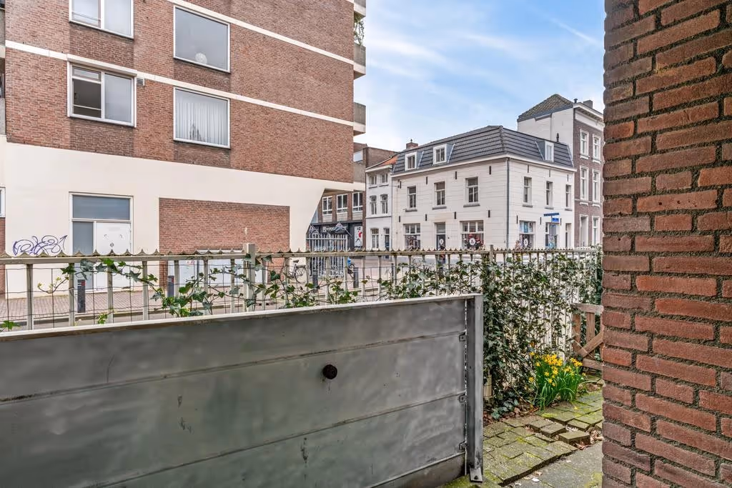 Vanuit de woonkamer is het balkon / het tuintje te bereiken. Deze fijne buitenruimte is voldoende ruim en kijkt mooi weg, richting de oude panden aan de singel.
