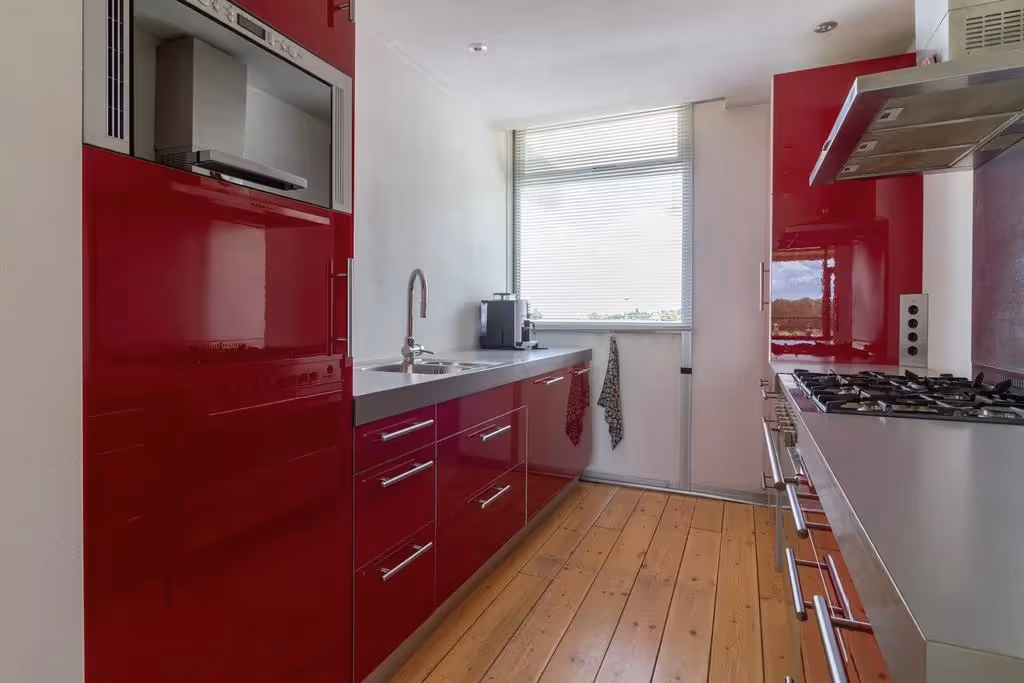 Het appartement is gelegen op de 4e verdieping van dit complex. U komt binnen in de hal met moderne meterkast en toegang tot de woonkamer. Naast de hal, aan de zijde van de galerij, ligt de half open keuken. Deze bevat een modern en opvallend blok, met alle gangbare inbouwapparatuur. Zo zijn een 6-pits gasfornuis, afzuigkap, koelkast, vriezer, een brede oven en vaatwasser, allemaal ingebouwd.
