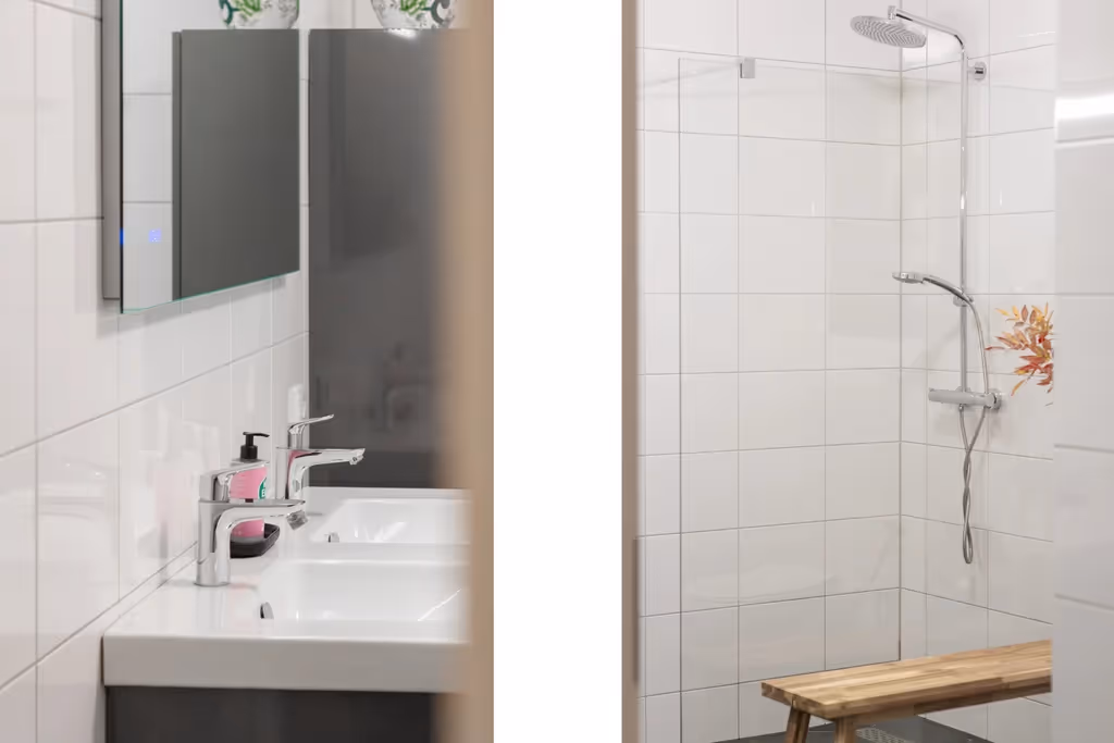 Vanuit de entreehal zijn verder nog het gastentoilet, de beide slaapkamers en de moderne badkamer te bereiken. Zowel de hoofdslaapkamer, als de logeerkamer hebben een uitstekend niveau van afwerking, met pvc vloeren en staan beide ook middels grote glazen puien in verbinding met het dakterras. De moderne badkamer is voorzien van een riante inloopdouche, een wastafelmeubel met dubbele wastafel en een 2e toilet.