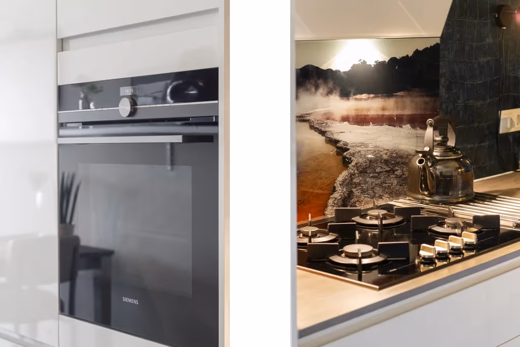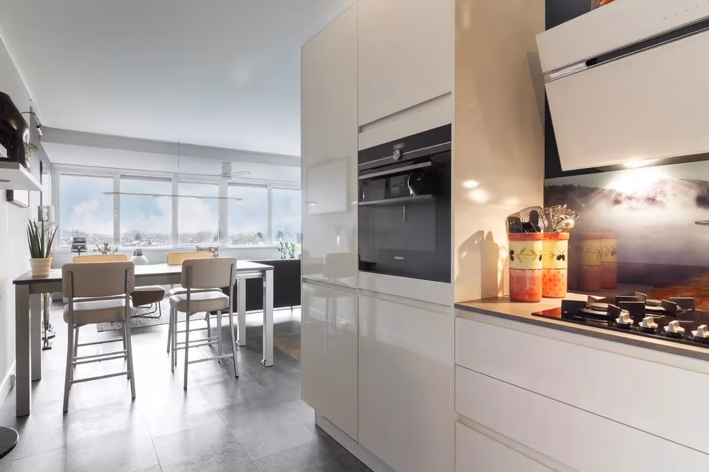 Vanuit de hal is de woonkamer toegankelijk. Ook hier trekt het mooi uitzicht over Herten de aandacht. De woonkamer zelf is voorzien van een moderne pvc vloer en wederom van extra maatwerk in het interieur. De woonkamer staat in verbinding met de half open keuken, welke beschikt over een hoekopstelling en van alle gemakken is voorzien. Zo heeft de keuken een 4-pits gasfornuis, afzuigkap met plasma filter, een koelkast, vriezer en Siemens vaatwasser. Naast de keuken is een ruime berging gelegen, met daarin de technische installaties. Zo heeft het appartement een warmte-terug-win unit (WTW) en een CV combiketel (Intergas, 2018, eigendom) en een collector voor de zonnepanelen. Voorts zijn de aansluitpunten voor het witgoed in deze berging gelegen.
