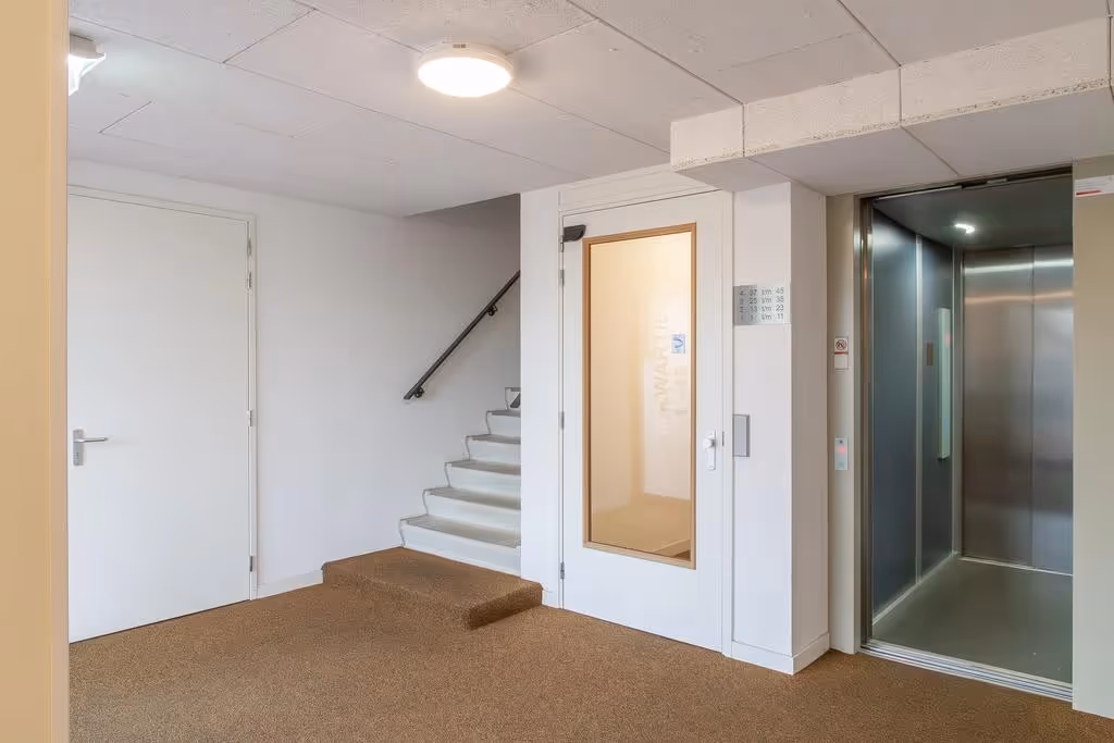 Centrale entreehal met brievenbussen, intercom en liftinstallatie. Verder bereikt u vanuit de centrale hal ook de parkeergarage, waar het appartement een parkeerplaats heeft en waar de berging (5 m²) gelegen is.