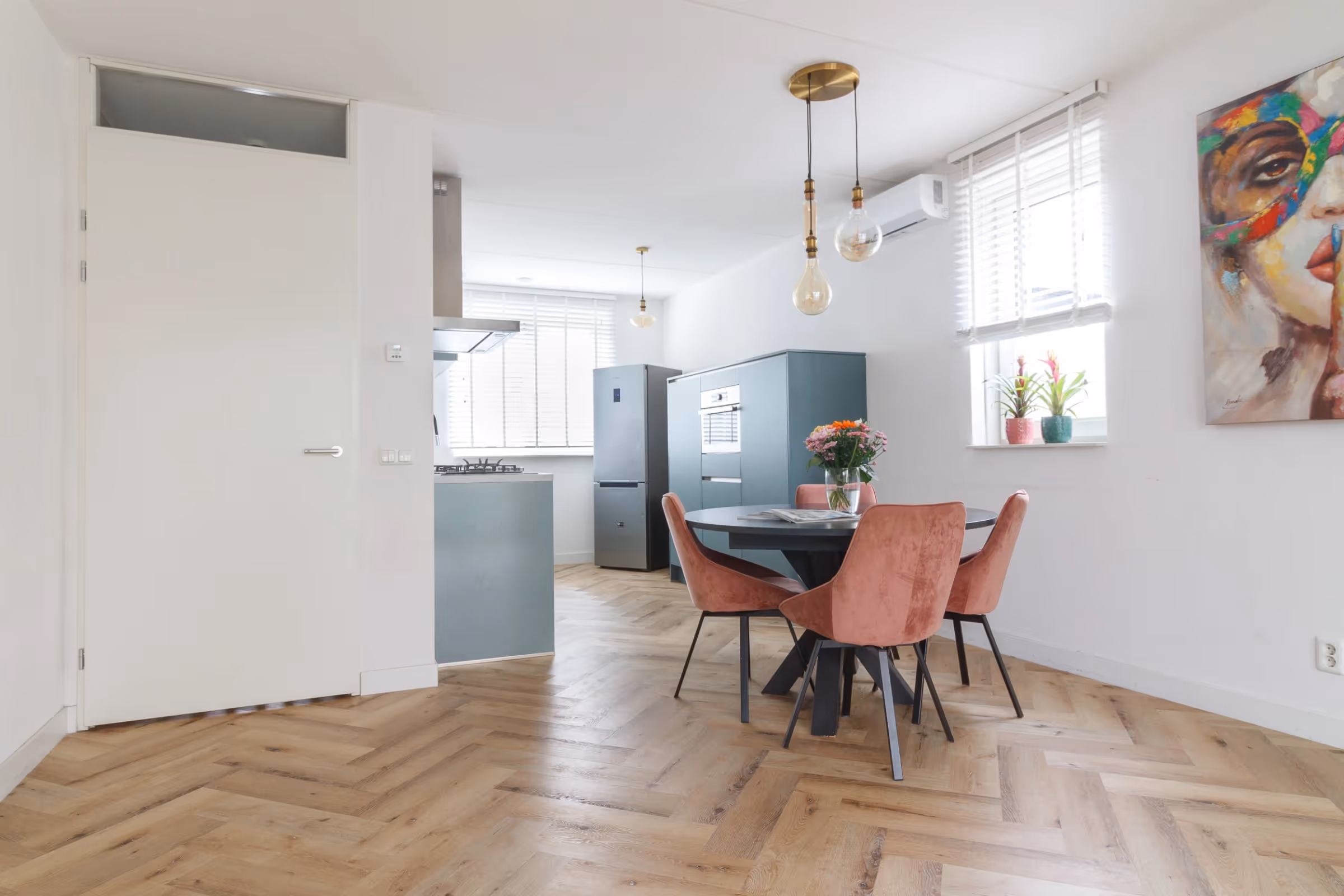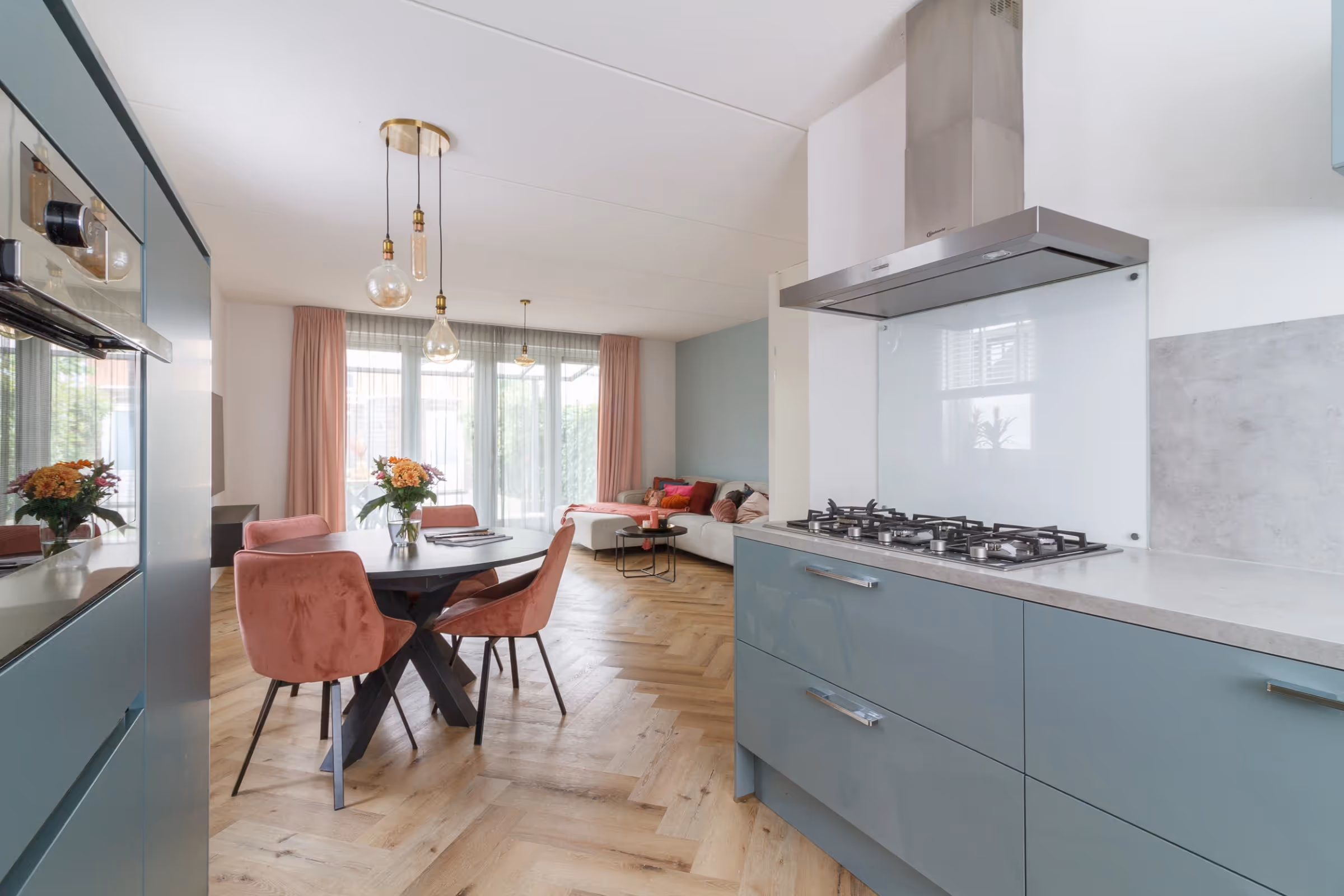 Via de entreehal, waar tevens het gastentoilet met fonteintje en de meterkast zijn gelegen, kom je in de woonkamer. Deze woonkamer ligt aan de achterzijde van de woning en heeft zicht op de tuin. De woonkamer beschikt over een hoogwaardige PVC vloer en een grote trapkast. Aan de voorkant van het huis ligt de keuken. Deze stijlvolle keuken beschikt over de volgende inbouwapparatuur: 5-pits gasfornuis met afzuigkap, combi-oven en handige vaatwasser. Tenslotte heeft de gehele begane grond vloerverwarming en is er een airconditioning in de woonkamer.