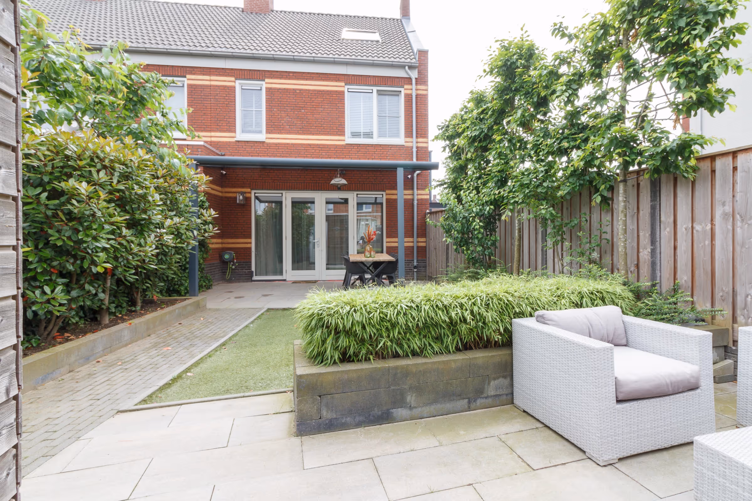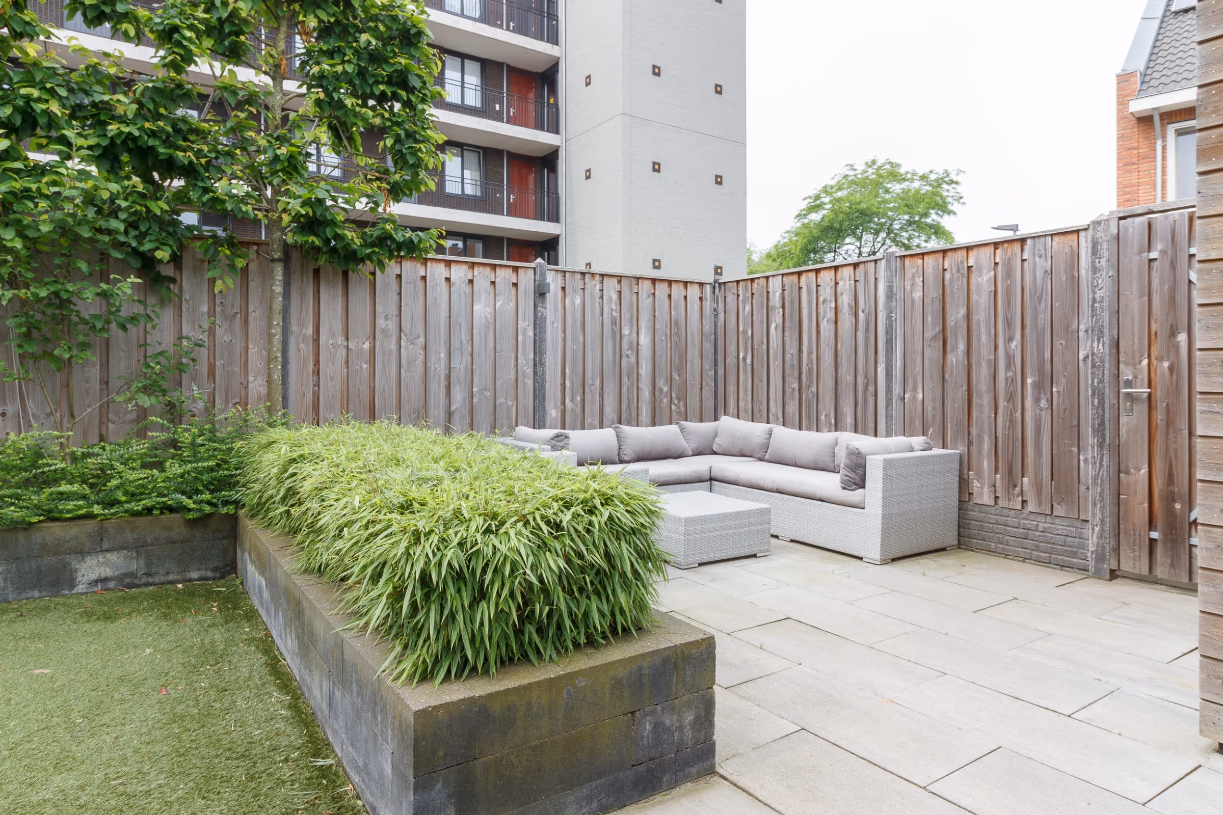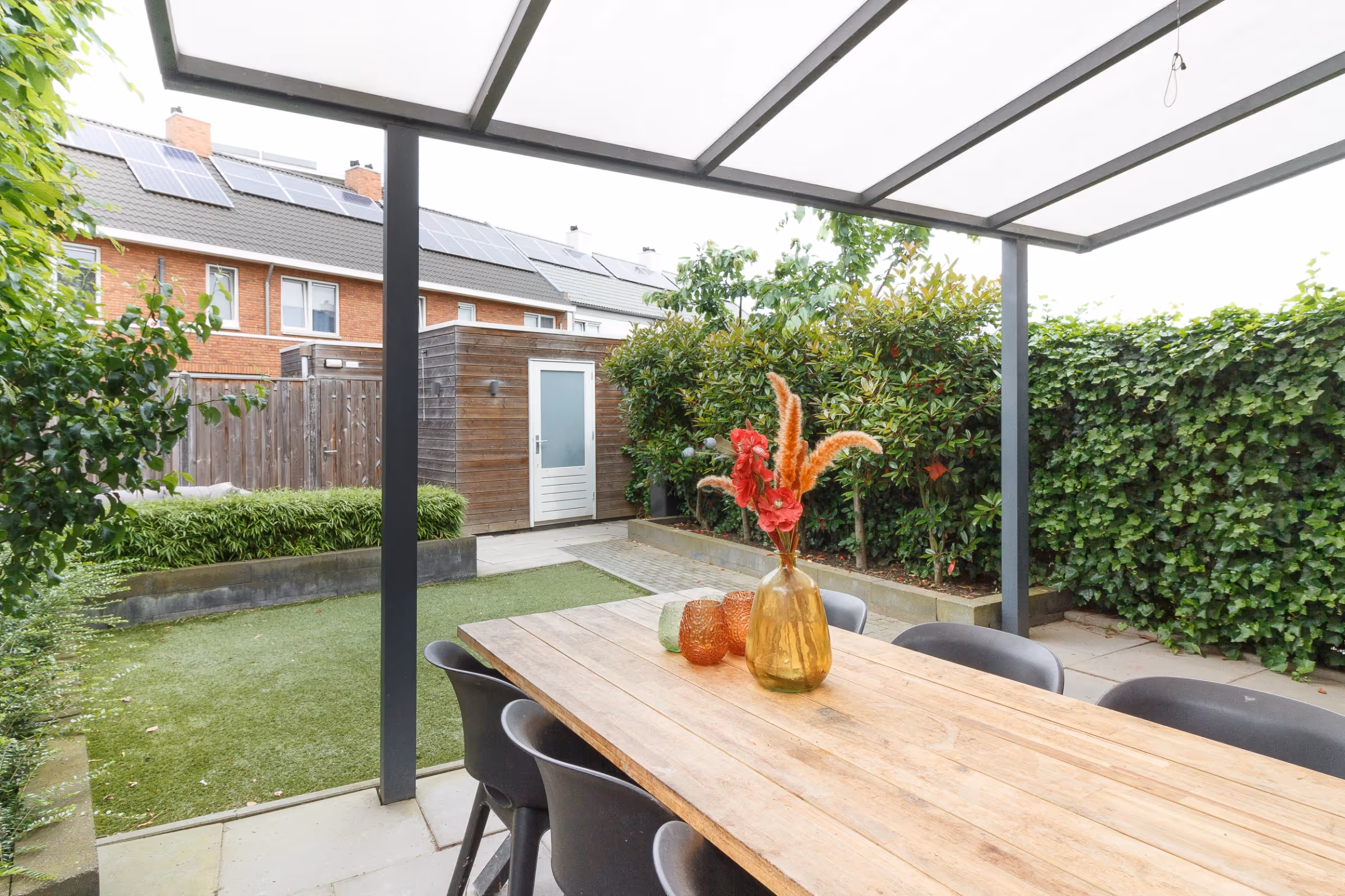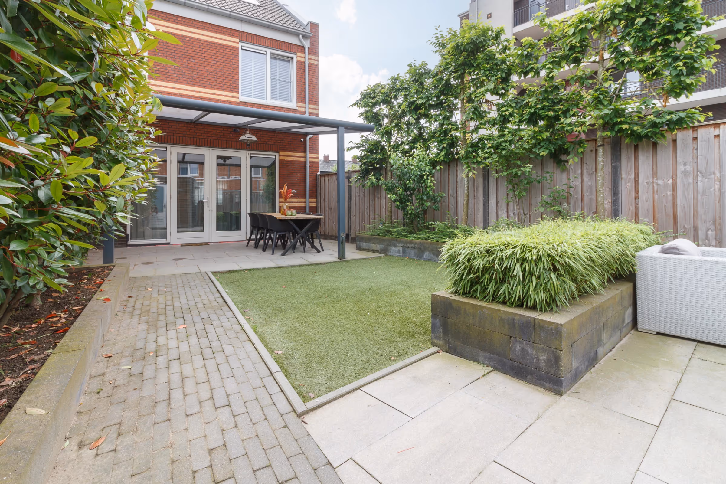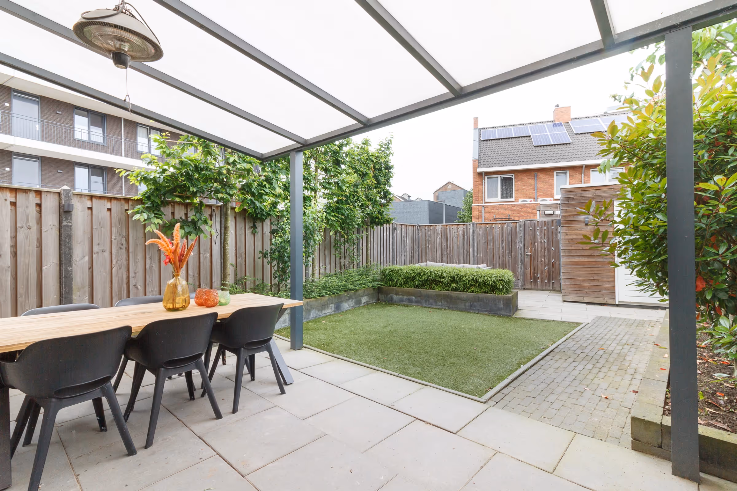 De achtertuin van dit fijne woonhuis is prachtig aangelegd met 2 terrassen, een gazon van kunstgras en enkele borders met beplanting. De tuin is geheel omheind en het terras achter de woning is voorzien van een luxe terrasoverkapping. Verder is in de tuin een houten tuinberging gelegen en is de tuin bereikbaar via een achterom. Hier kom je uit op het achtergelegen parkeerterrein, waar ook deze woning een eigen privé parkeerplaats heeft.