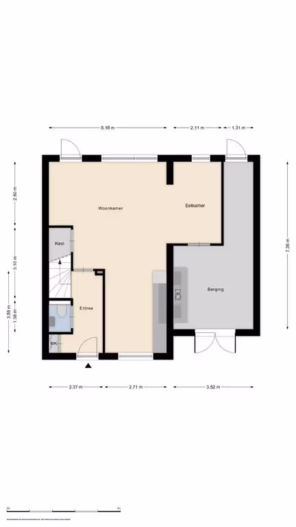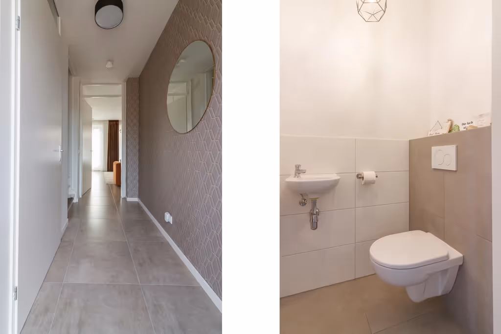 Entree in de hal met toilet, moderne meterkast en toegang tot de woonkamer. De ruime en stijlvolle woonkamer heeft een uitstekend niveau van afwerking, met o.a. een fraaie tegelvloer met vloerverwarming. Aan de zijkant is de woonkamer vergroot met een uitbouw, in de voormalige garage, waardoor je nog meer leefruimte hebt. Hier bevindt zich nu de eethoek. De keuken ligt aan de voorzijde van het huis en heeft een moderne opstand, met alle gangbare inbouwapparatuur. Zo zijn er een inductiekookplaat, design afzuigkap, koelkast, combi oven en vaatwasser. Tenslotte ligt in de woonkamer nog een trapkast (met de unit van de vloerverwarming) en is vanuit de woonkamer de inpandige berging te bereiken. Deze berging is ruim en herbergt de aansluitpunten van het witgoed.