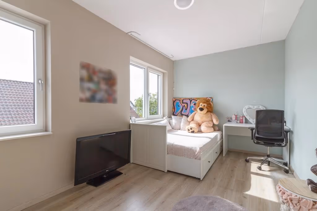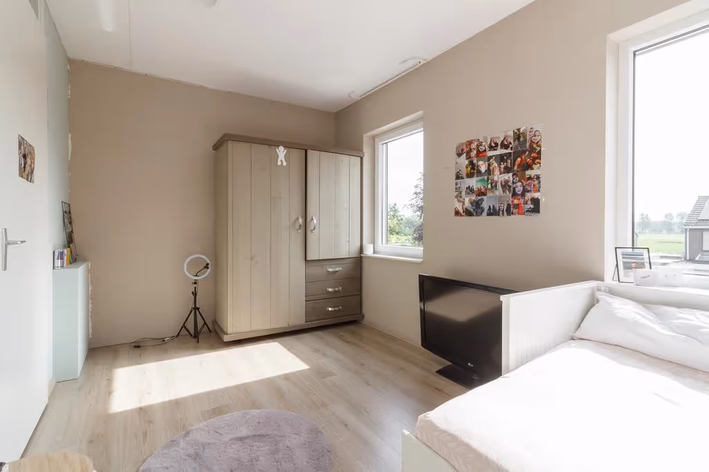 Via een vaste trap is de riante zolderverdieping toegankelijk. Hier ligt een ruime, extra (slaap)kamer en hier is een kastenwand met veel bergruimte. In deze kast zijn tevens de technische installaties geplaatst. Zo beschikt dit woonhuis over een elektrische CV installatie, een boiler (beide van Vaillant, eigendom en uit 2021) en warmte-terug-win systeem (WTW, van Zehnder en ook uit 2021).