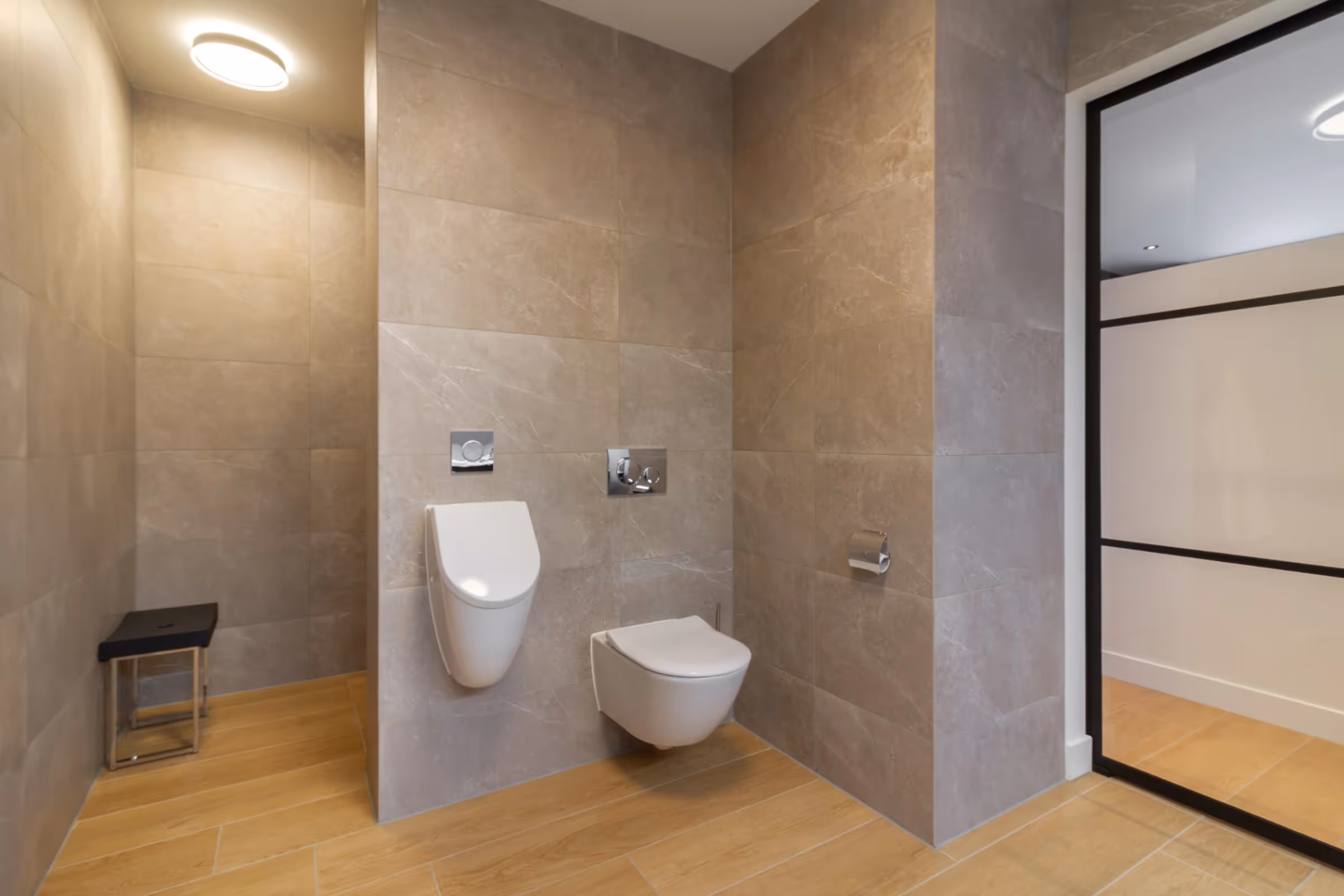 De badkamer biedt hetzelfde comfort, als de rest van deze sfeervolle penthouse. Zo zijn hier een riante inloopdouche, een op maat gemaakt wastafelmeubel over de gehele breedte van de ruimte, met dubbele wastafel en veel bergruimte. Tenslotte een 2e toilet en urinoir.