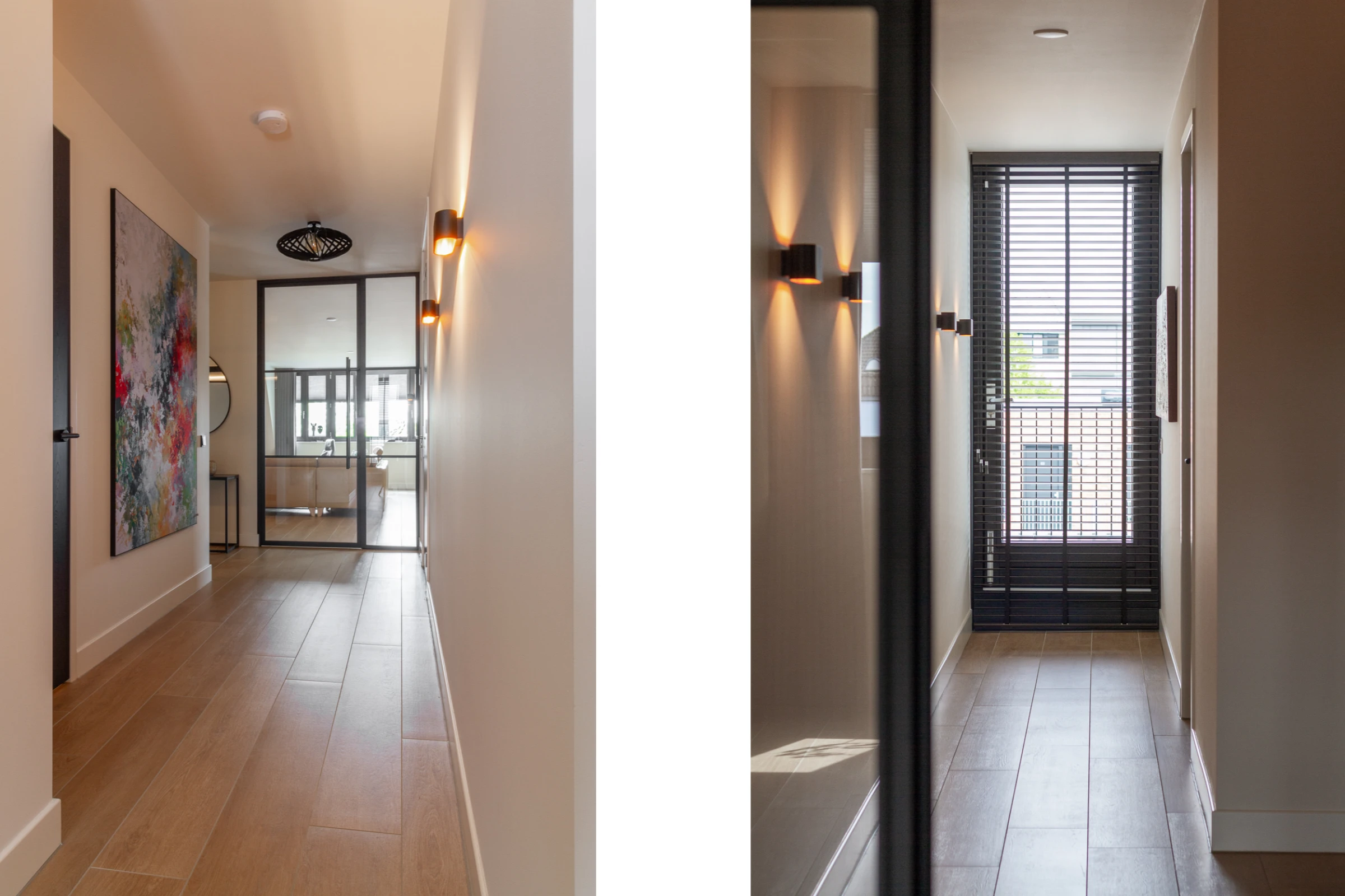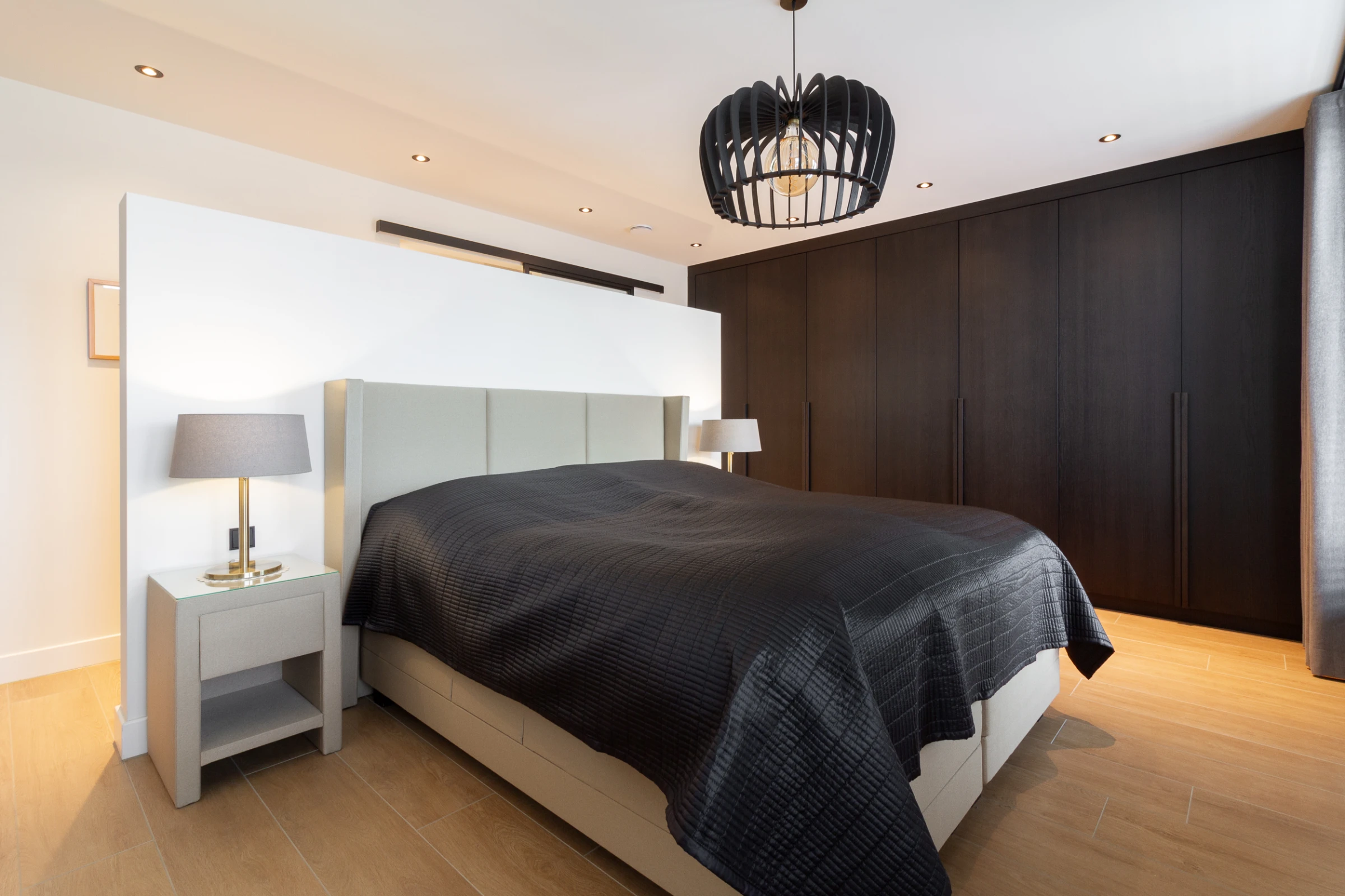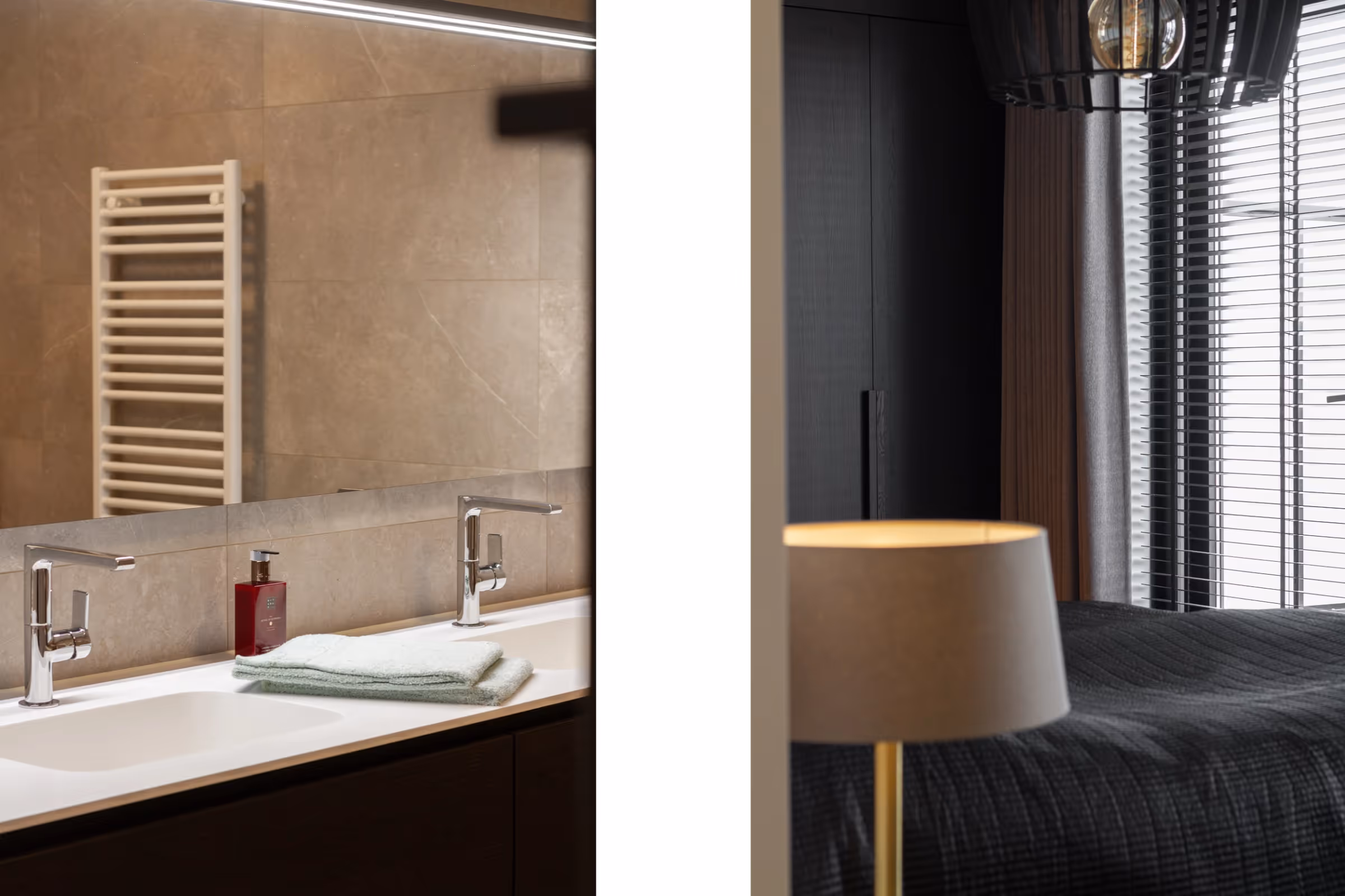 Deze woning beschikt over 3 riante slaapkamers, waarvan er momenteel 1 in gebruik is als thuiskantoor. Alle 3 de slaapkamers hebben dezelfde mooie tegelvloer als de living en de kozijnen van alle drie de kamers lopen door tot vloerniveau. Ook bevatten de kamers maatwerk inbouwkasten, in dezelfde luxueuze stijl als de woonkamer. Voorts heeft elke slaapkamer zicht op het dakterras aan de achterzijde, waar de zon speels door de ramen naar binnen schijnt. Zo wordt u ’s ochtends heerlijk wakker, wat wilt u nog meer?