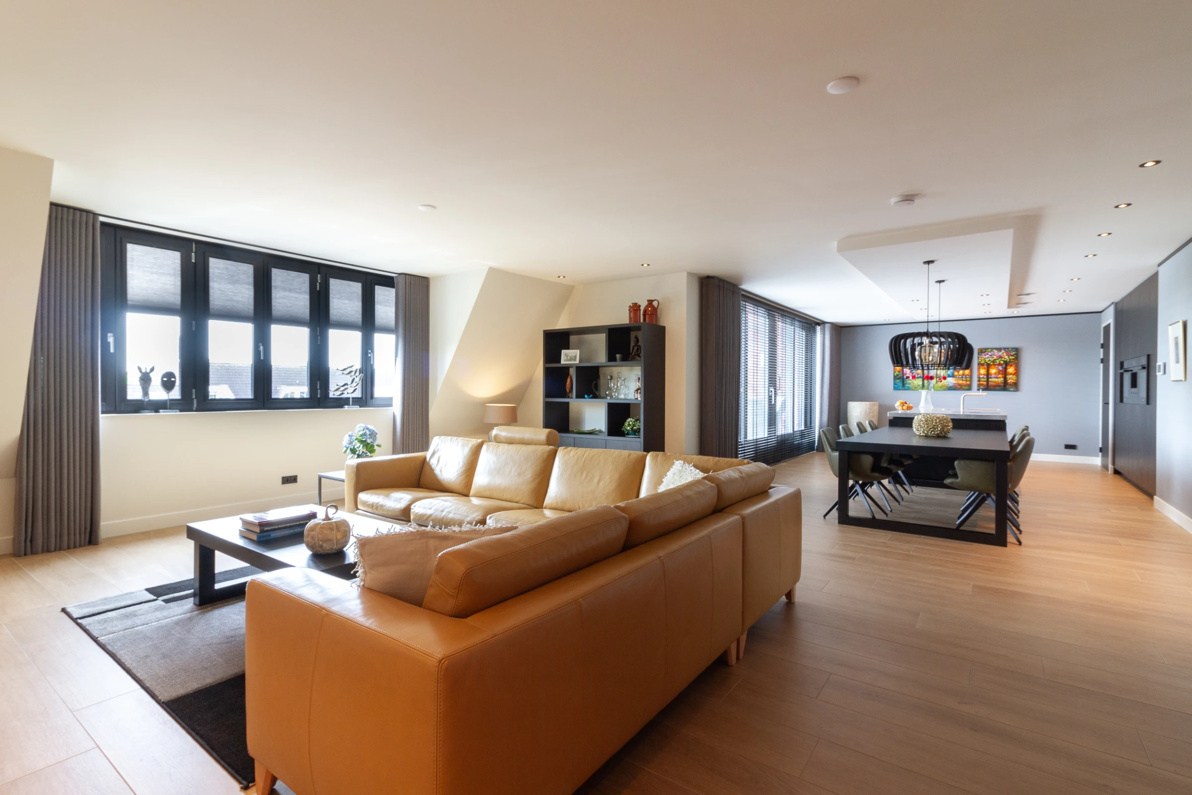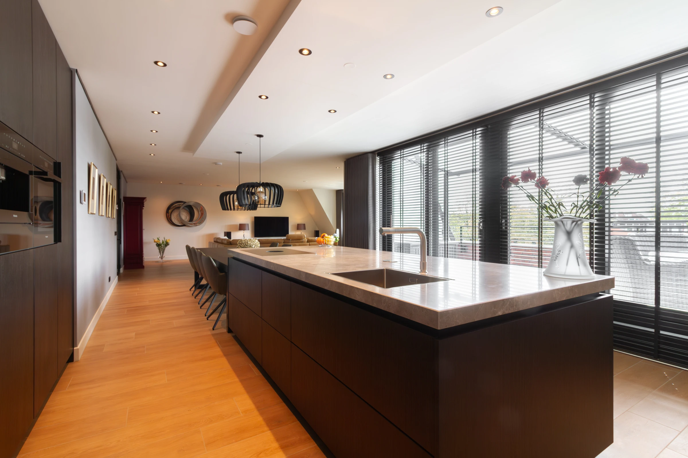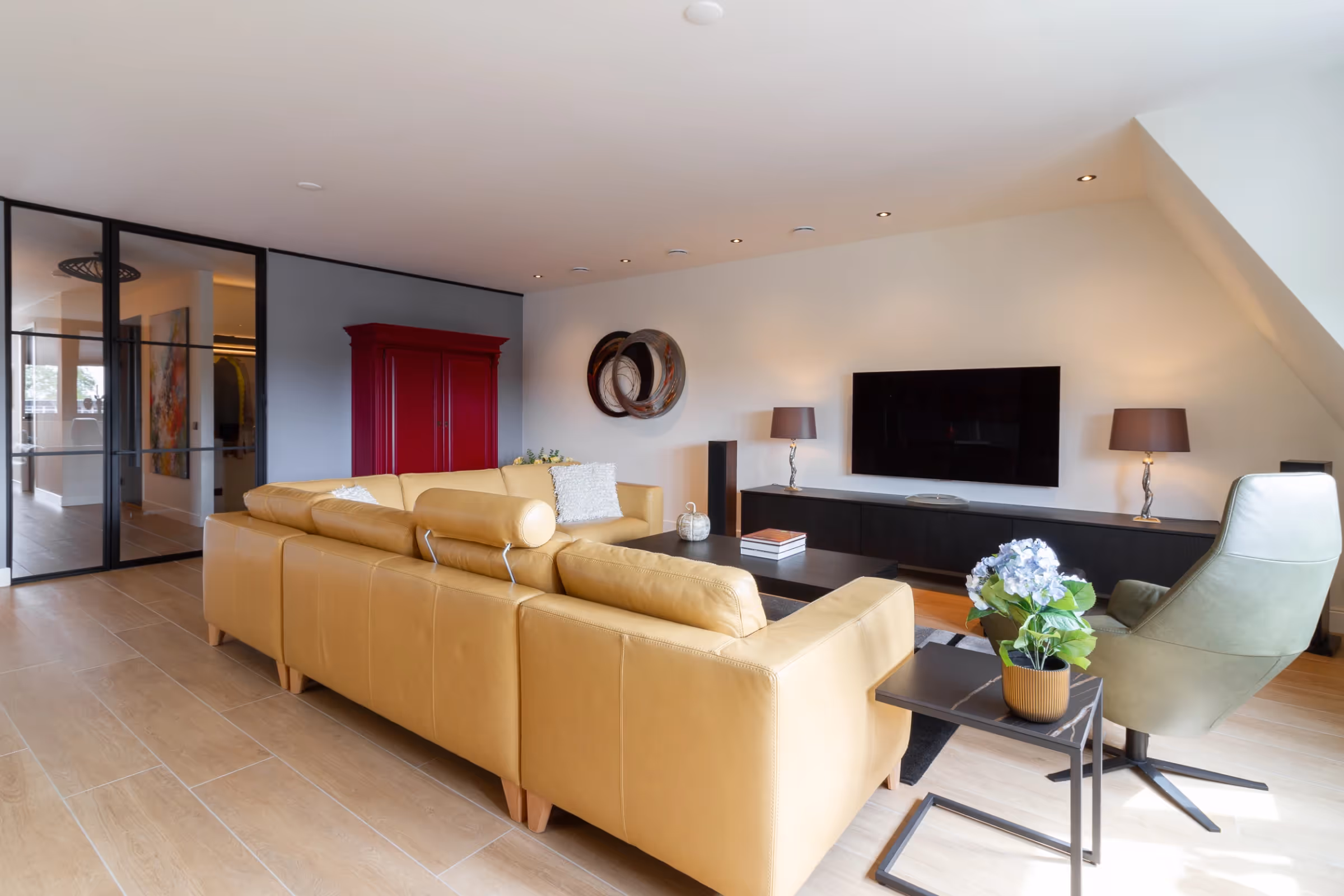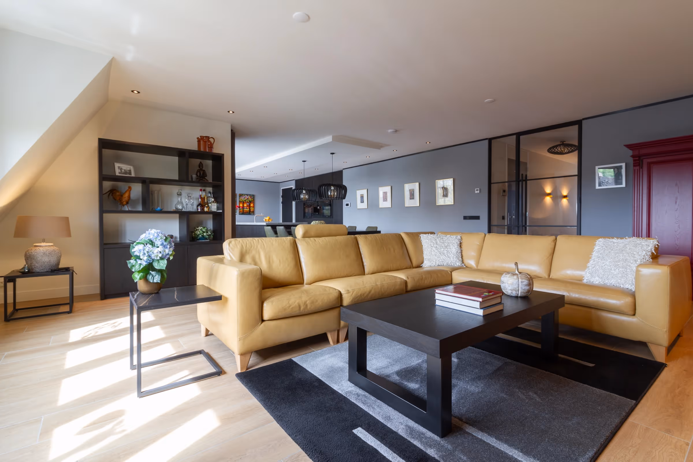 De royale living van deze charmante woning is voorzien van een hoogwaardig niveau van afwerking, met o.a. een keramische tegelvloer met houtlook en veel maatwerk interieurbouw. De woonkamer staat in open verbinding met de luxe woonkeuken.