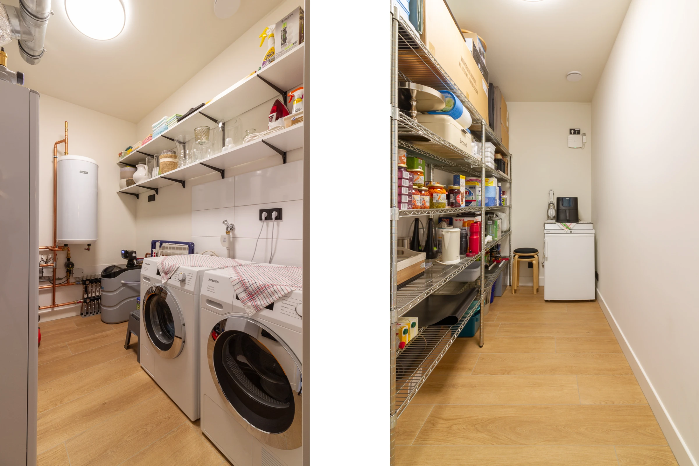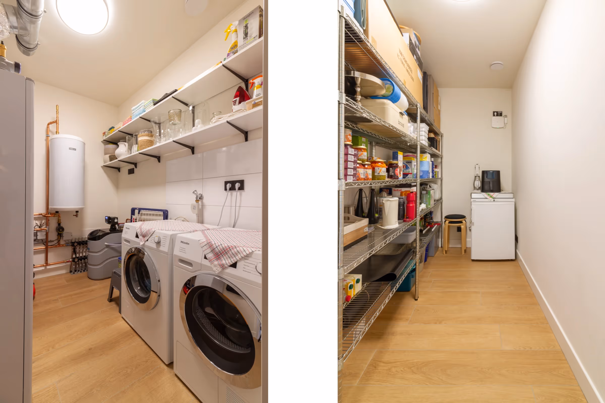 Behalve de bijkeuken, welke grenst aan de keuken, heeft dit object ook een 2e berging, c.q. technische ruimte, waar zich de technische installaties en aansluitpunten voor het witgoed bevinden. Zo staat hier de warmtepomp (Nibe, eigendom, 2023) en hangt hier de WTW unit (Zehnder, eigendom, 2023). Tenslotte zitten hier de unit van de vloerverwarming, een waterontharder en de hydrofoor.