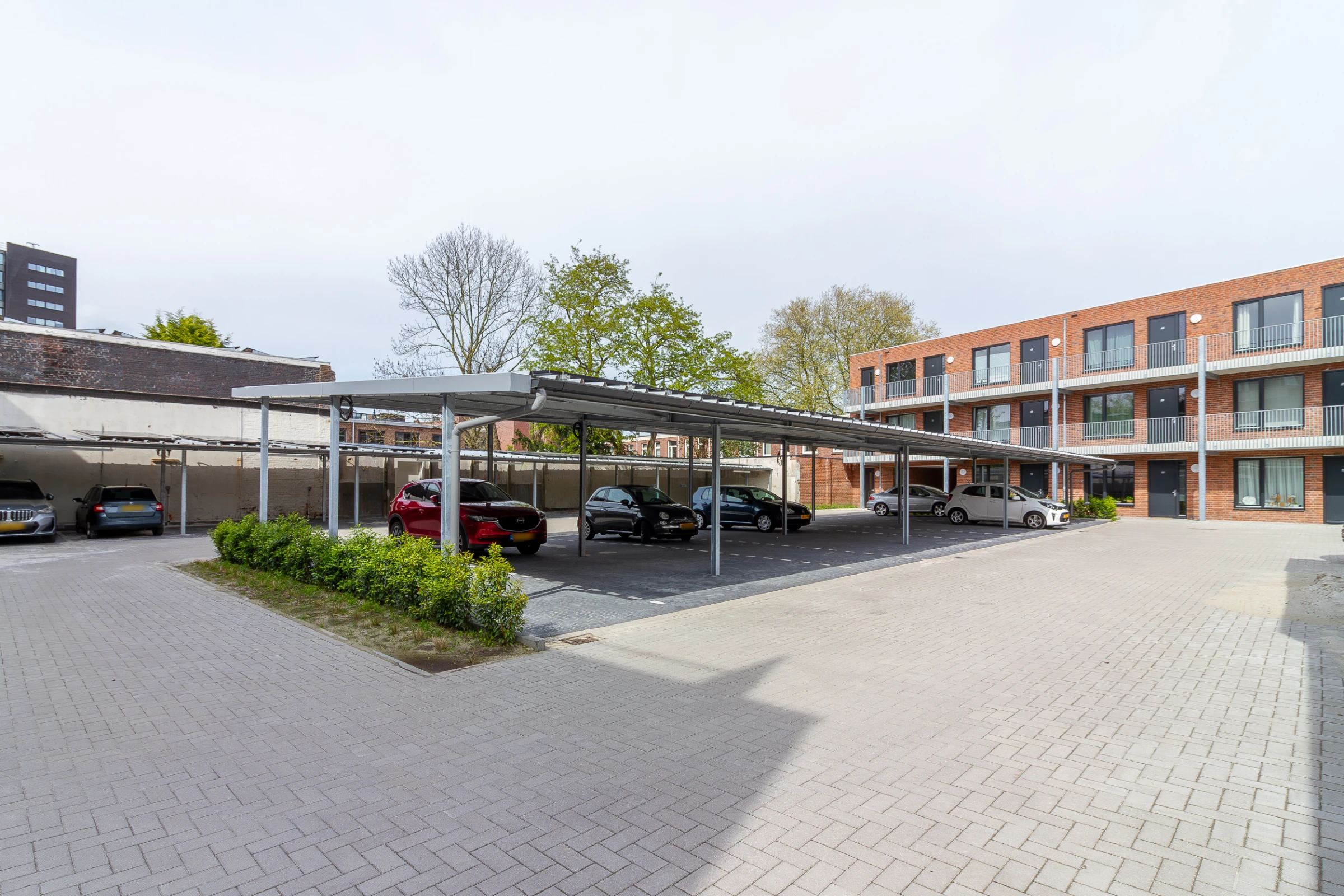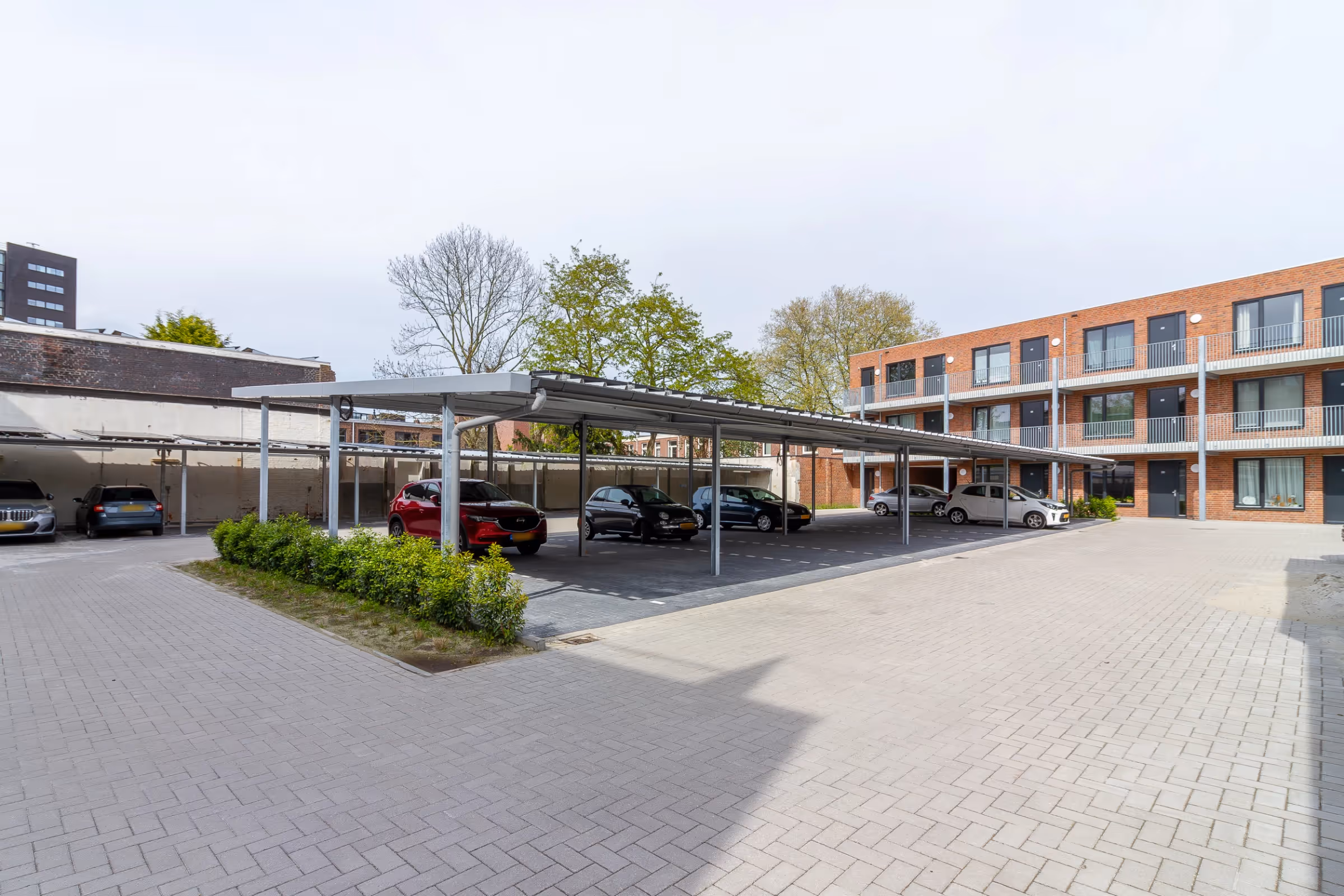 Centrale entreehal met brievenbussen, intercom en liftinstallatie. Ook bereikt u vanuit de centrale hal de bergingen die bij de appartementen horen en waar dit appartement zijn eigen berging heeft. Aan de achterzijde, via de Ernst Casimirstraat, is het afgesloten parkeerterrein toegankelijk. Parkeren is mogelijk op één van de 2 privé parkeerplaatsen (waarvan 1 parkeerplaats reeds over de voorbereiding voor een laadpaal beschikt) en op de bezoekersparkeerplaats op het terrein.