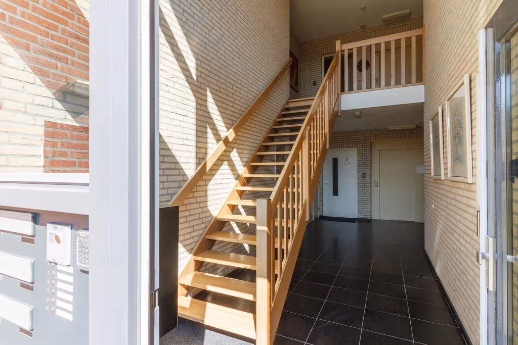 U komt binnen in de centrale entreehal met brievenbussen, intercom en liftinstallatie. Ook liggen op de begane grond de eigen berging en de parkeerplaats. Het complex heeft een keurig onderhouden binnentuin, met prieeltje waar regelmatig door de bewoners een en ander wordt georganiseerd.
