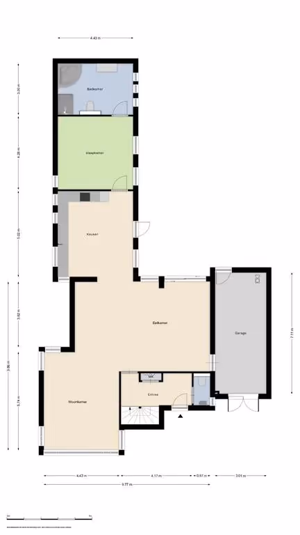Vanuit de entreehal van dit woonhuis zijn de diverse vertrekken en het toilet te bereiken. De riante woonkamer heeft een mooie lichtinval door de vele ramen en de schuifpui naar de tuin. Voorts bevat de woonkamer een sfeervolle gashaard en is de gehele begane grond (behalve de garage) voorzien van een comfortabele vloerverwarming. De keuken ligt naast de woonkamer en heeft een royaal keukenblok met veel kastruimte. Uiteraard is de keuken van alle gemakken voorzien en beschikt deze over de volgende inbouwapparatuur: een 4-pits inductie kookplaat met wasemkap, koelkast, magnetron en vaatwasser. Op de begane grond ligt ook de hoofdslaapkamer, met een luxe badkamer en suite. Ook deze hoofdslaapkamer heeft veel ruimte, net als de woonkamer en een keurig niveau van afwerking, met o.a. een nette vloer. De badkamer bevat een royaal ligbad, douche met dubbele wastafel. Tenslotte ligt op de begane grond nog de inpandige garage. Deze garage heeft een elektrische sectionaalpoort, aansluitpunten voor het witgoed en een deur naar de tuin. De oppervlakte van deze garage is een royale 21 m².