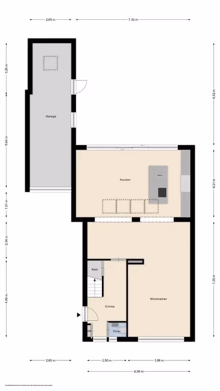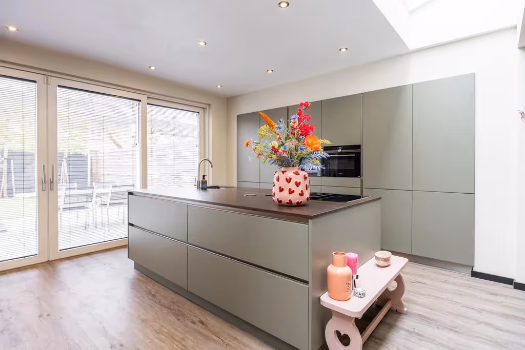 Via de entreehal, waar tevens het gastentoilet en de meterkast zijn gelegen, kom je in de woonkamer. Deze grote woonkamer is heeft een uitstekend niveau van afwerking en is ruim van opzet, mede door de uitbouw aan de achterzijde. Hier ligt ook de fraaie leefkeuken, met riant kookeiland, welke van alle gemakken is voorzien. De Keller keuken is uitgevoerd met de volgende inbouwapparatuur: een inductiekookplaat met ingebouwde afzuiging, koelkast, vriezer, combi oven, stoomoven en vaatwasser. Tenslotte heeft de begane grond een airco (2018) en een luxe pvc vloer (2022) met houtlook en vloerverwarming.