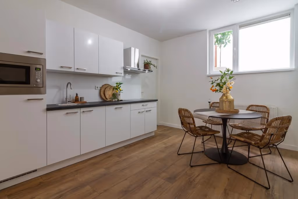 Dit appartement ligt beneden en aan de achterzijde. Alvorens je in het appartement komt, daal je enkele traptreden af, hetgeen het appartement een intiem en geborgen gevoel geeft. Je komt gelijk binnen in de woonkamer met open keuken. Door het hele appartement ligt een fraaie vloer en de keuken beschikt over een blok met de volgende inbouwapparatuur: een kookplaat met afzuigkap, een magnetron, een koelkast en handige vaatwasser. Verder heeft dit appartement 3 slaapkamers, of een thuiswerkplek en 2 slaapkamers, al naar gelang hetgeen jij fijn vindt. Vervolgens heeft het appartement ook nog een berging, met aansluitpunten voor de CV combiketel en de wasmachine, een apart en betegeld toilet en een badkamer met douche en wastafel.
