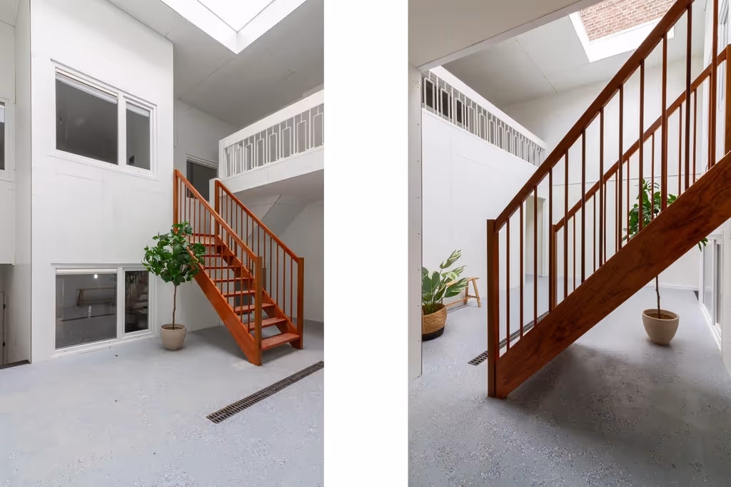 Via de centrale voordeur, naast de winkel, loop je door de gang naar het atrium (een centrale binnenplaats). Deze open ruimte is een echte eye catcher voor iedereen die één van de appartementen bezoekt. Vanuit dit atrium zijn alle 4 de appartementen toegankelijk. Dit zijn 2 appartementen aan de voorzijde, welke met hun ramen uitkijken op de Hamstraat en 2 appartementen aan de achterzijde, welke met hun ramen uitkijken op het terrein achter de Hamstraat en Kloosterwandstraat. Deze appartementen hebben geen parkeerplaatsen en je hebt hier ook geen recht op een parkeervergunning van de gemeente. Je zult dus elders in de stad een parkeerplaats moeten huren, mocht je ene nodig hebben. Dit is bijvoorbeeld mogelijk (indien beschikbaar) bij het complex Reijershof, welke dichtbij is gelegen.