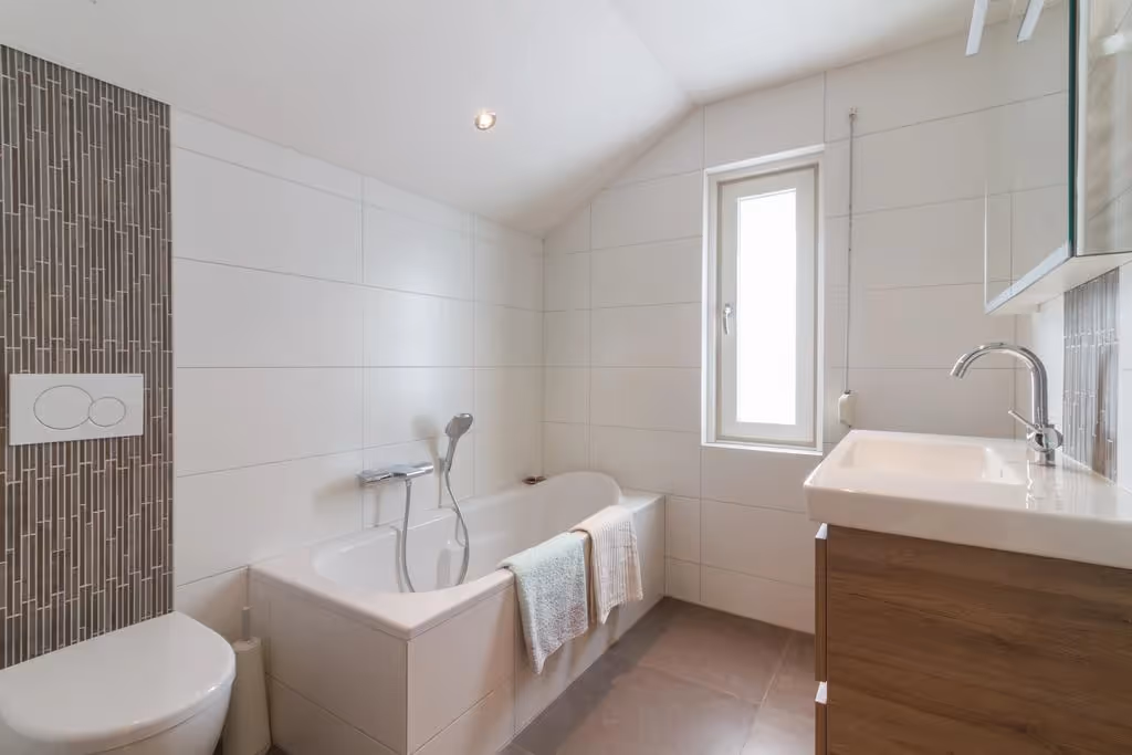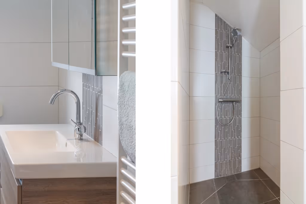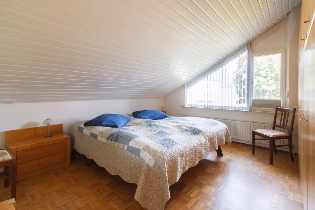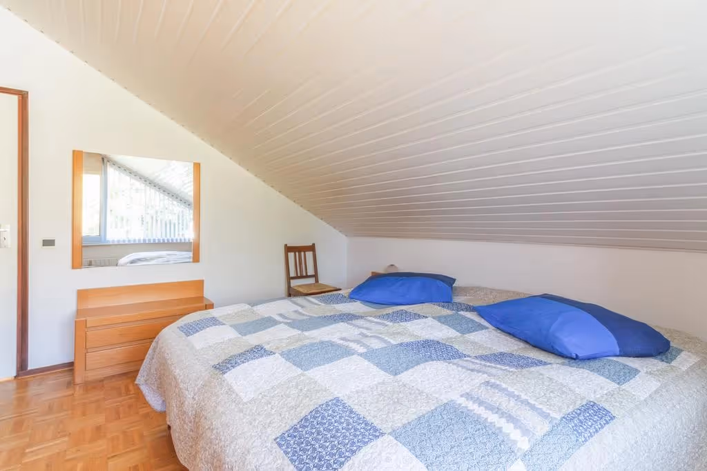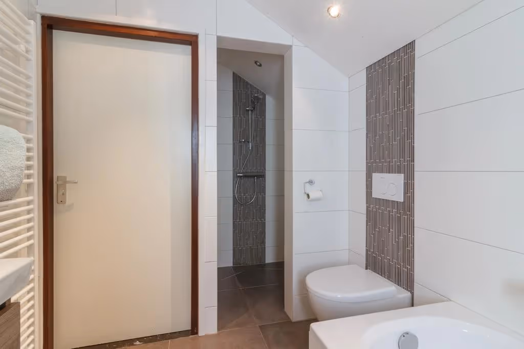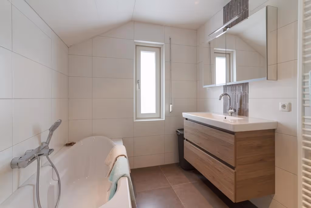Via de overloop op de 1e verdieping zijn maar liefst 4 slaapkamers, de moderne badkamer en een zolderverdieping boven de garage bereikbaar. Alle 4 deze slaapkamers hebben een keurig niveau van afwerking, met o.a. blokjesparket vloeren en 1 van de slaapkamers heeft een flinke dakkapel. De hoofdslaapkamer is aan de voorzijde gelegen. De moderne badkamer is voorzien van een luxe ligbad, een ruime inloopdouche, een riant wastafelmeubel en een 2e toilet. Verder heeft de badkamer vloerverwarming en een designradiator. Tenslotte is op deze verdieping nog een bergruimte, gelegen boven de inpandige garage. Deze zolderruimte herbergt de aansluitpunten van het witgoed en hier hangt de CV combiketel (Nefit, eigendom, 2021).