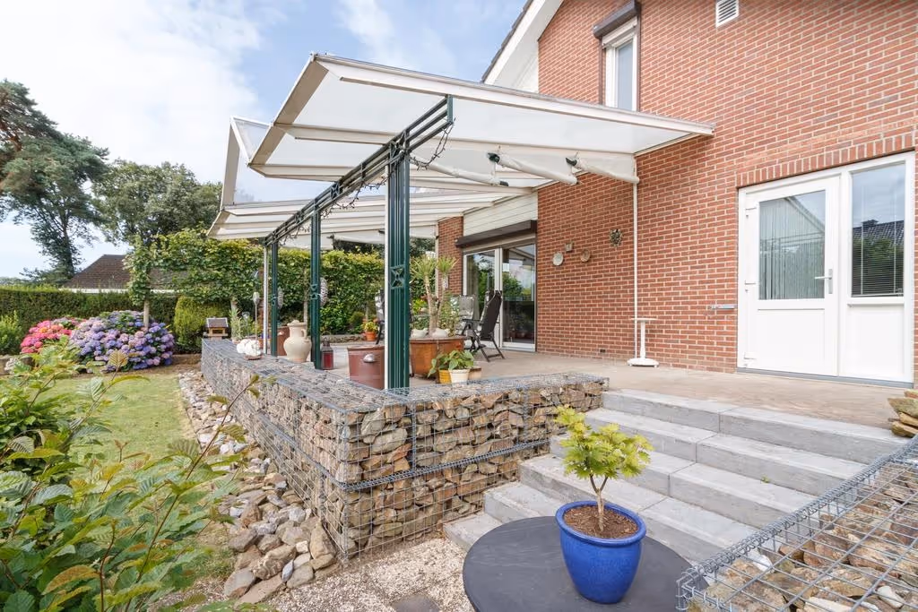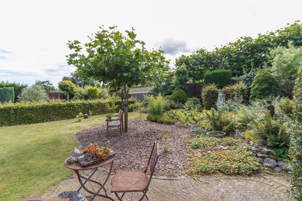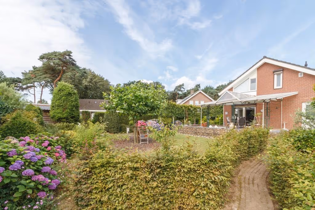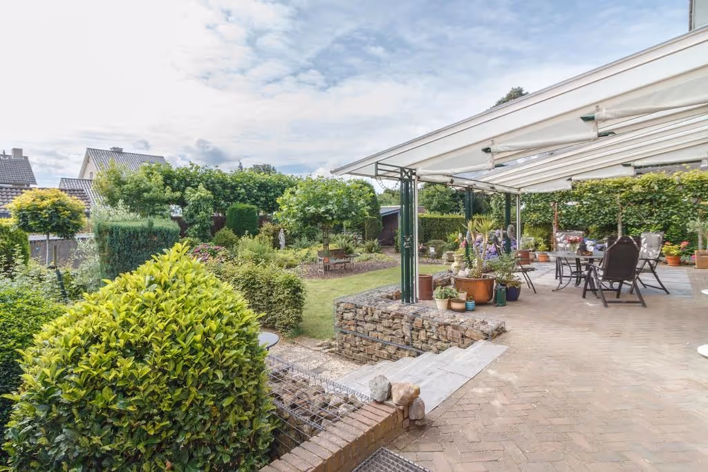 De riante tuin van dit fijne woonhuis is keurig netjes aangelegd en voorzien van volwassen begroeiing en beplanting. Achter de woning ligt een flink terras met grote terrasoverkapping en de tuin beschikt naast de garage over een eigen achterom. De tuin heeft een groot gazon, bevat veel privacy en is gelegen op het Zuid Oosten, waardoor deze heerlijk zonnig is. Tenslotte hoort bij deze tuin een extra, 2e perceel, waar een carport staat en welke afsluitbaar is met een poort. Ideaal dus om je auto, caravan, aanhanger of camper droog en veilig te stallen.