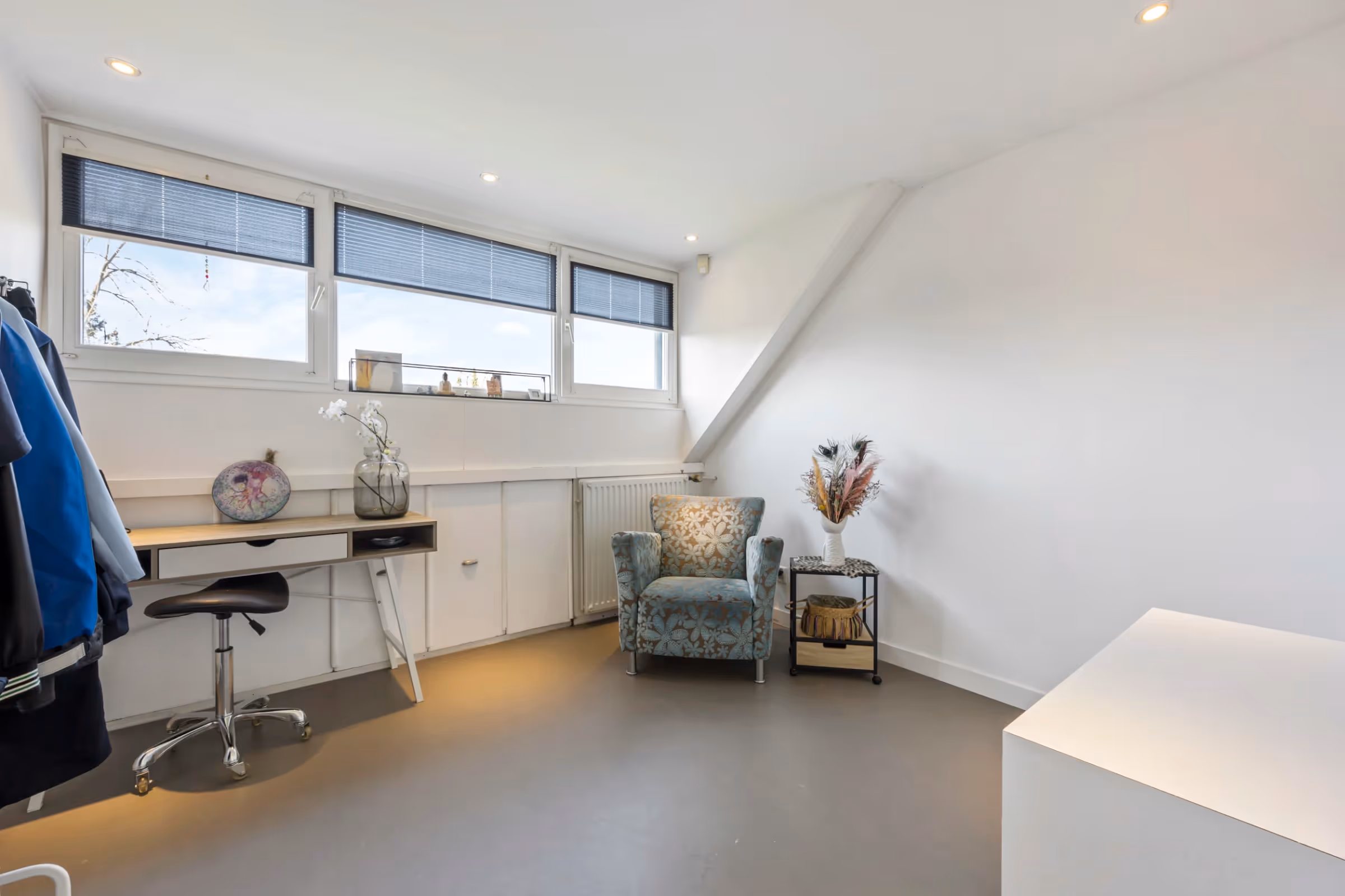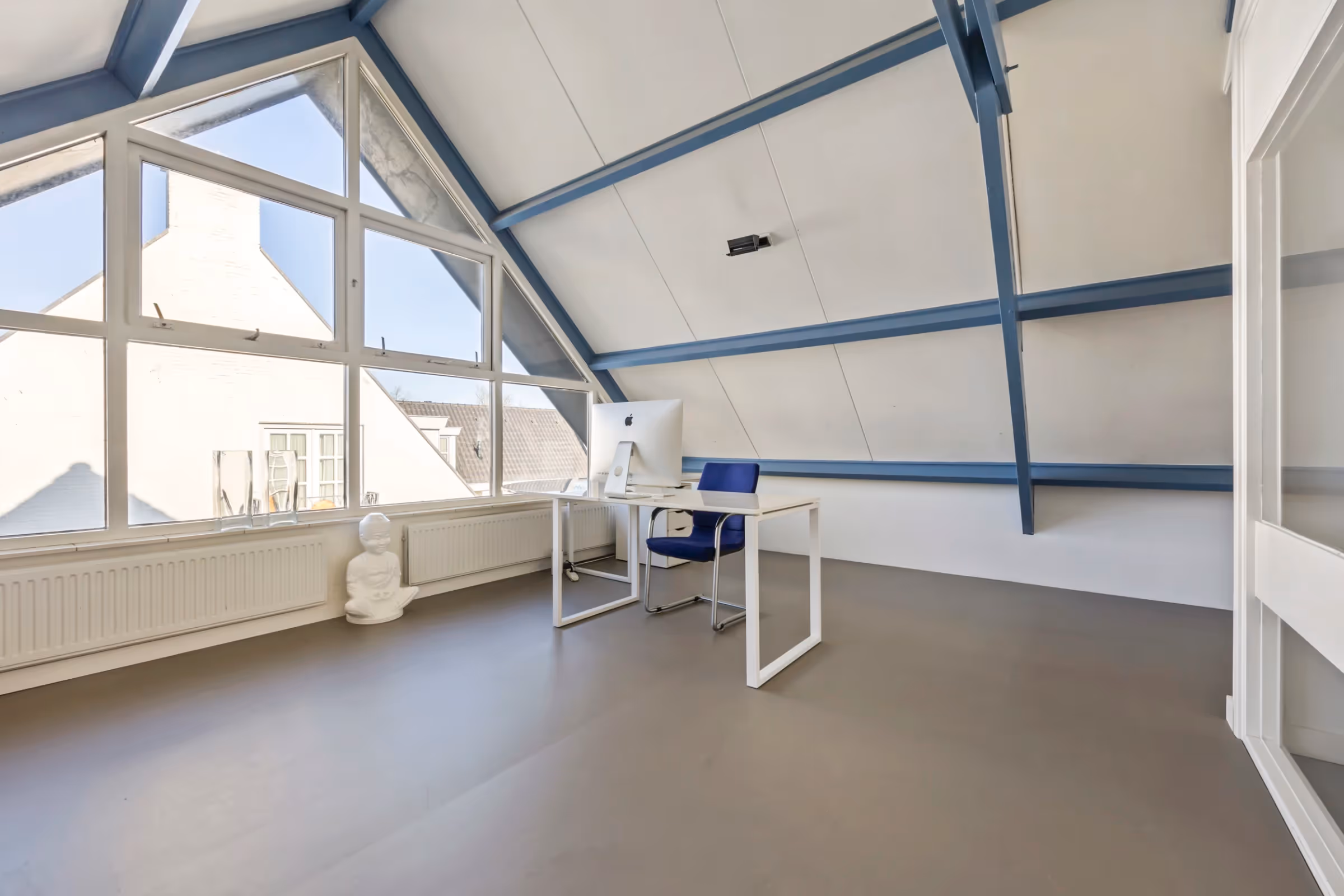 Op de 2e verdieping ligt de meest royale (slaap)kamer, welke momenteel als thuiswerkplek / kantoor in gebruik is. Deze kamer heeft weer fraaie, riante kozijnen, waardoor ook deze ruimte een erg prettige kamer is voor diverse doeleinden. Tenslotte is via een ladder ook een bergzolder bereikbaar op deze verdieping.