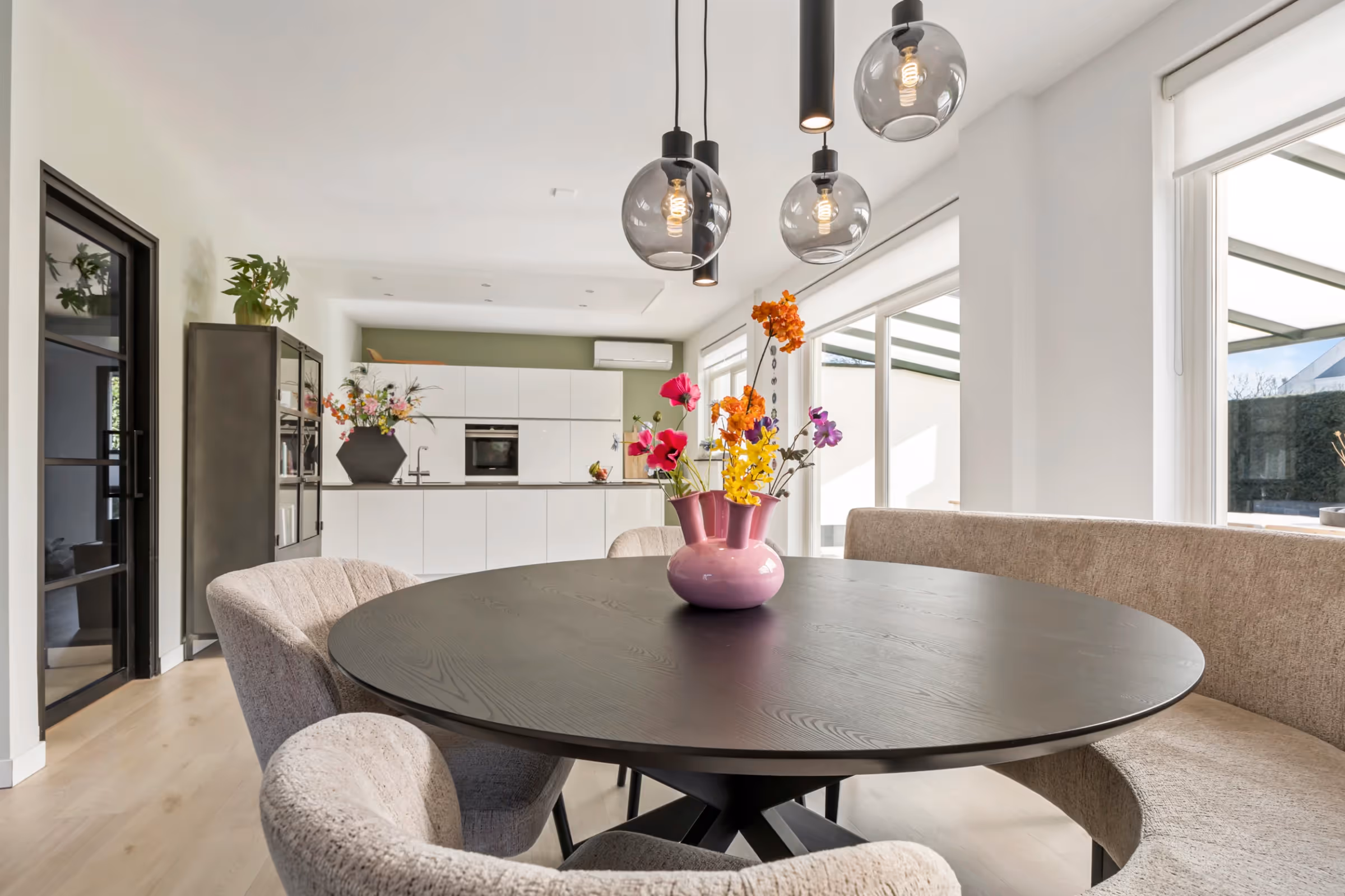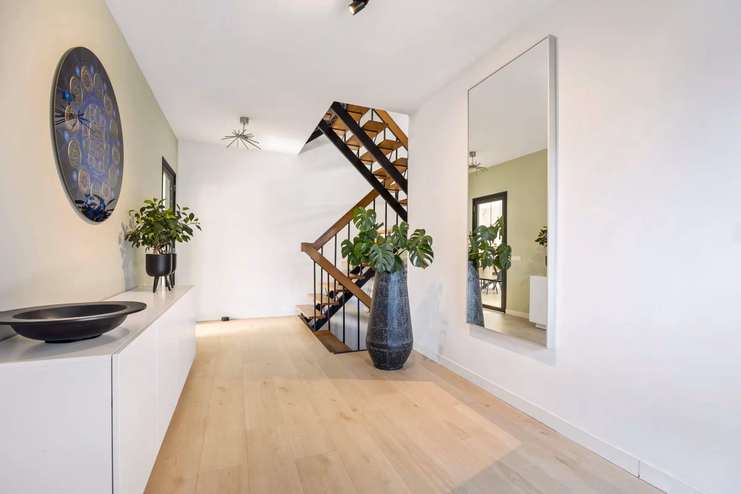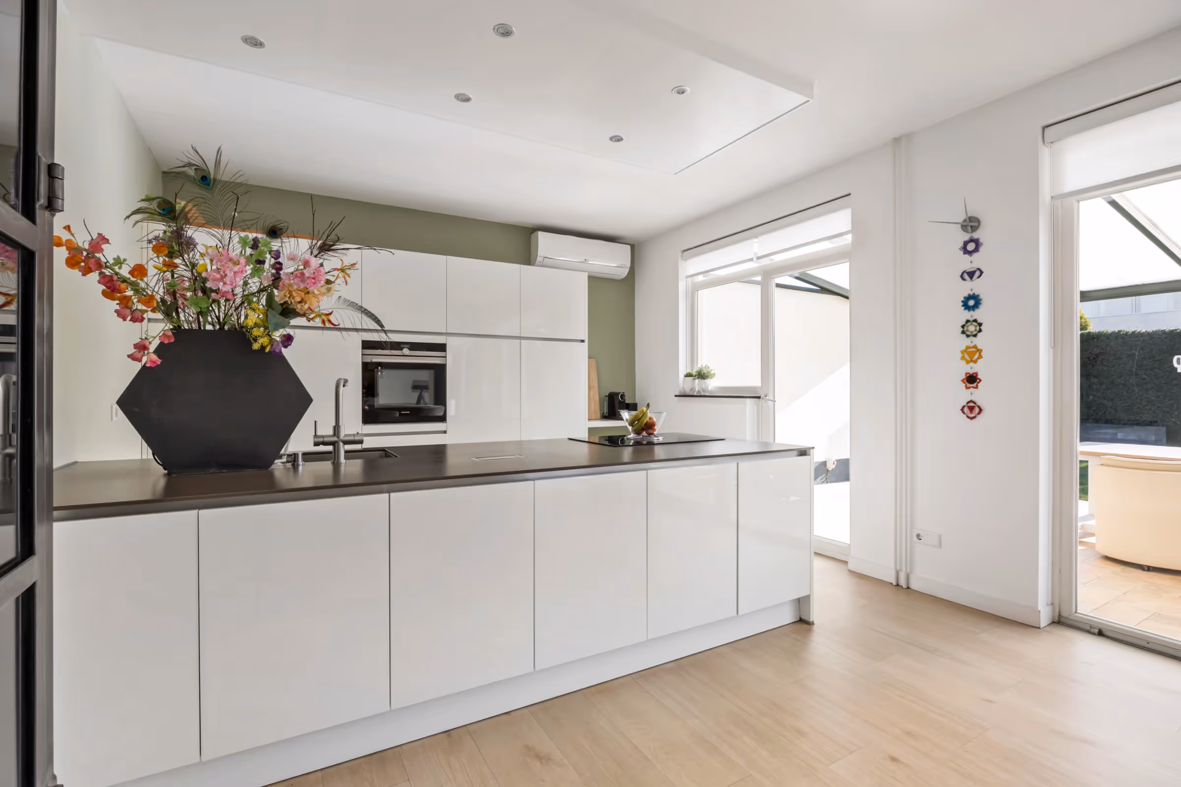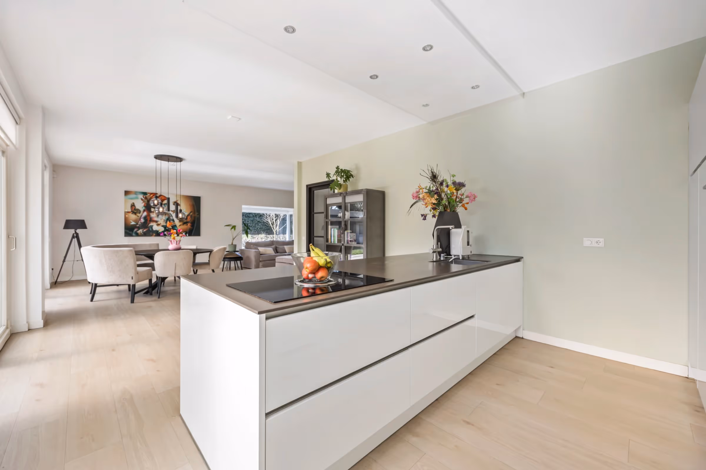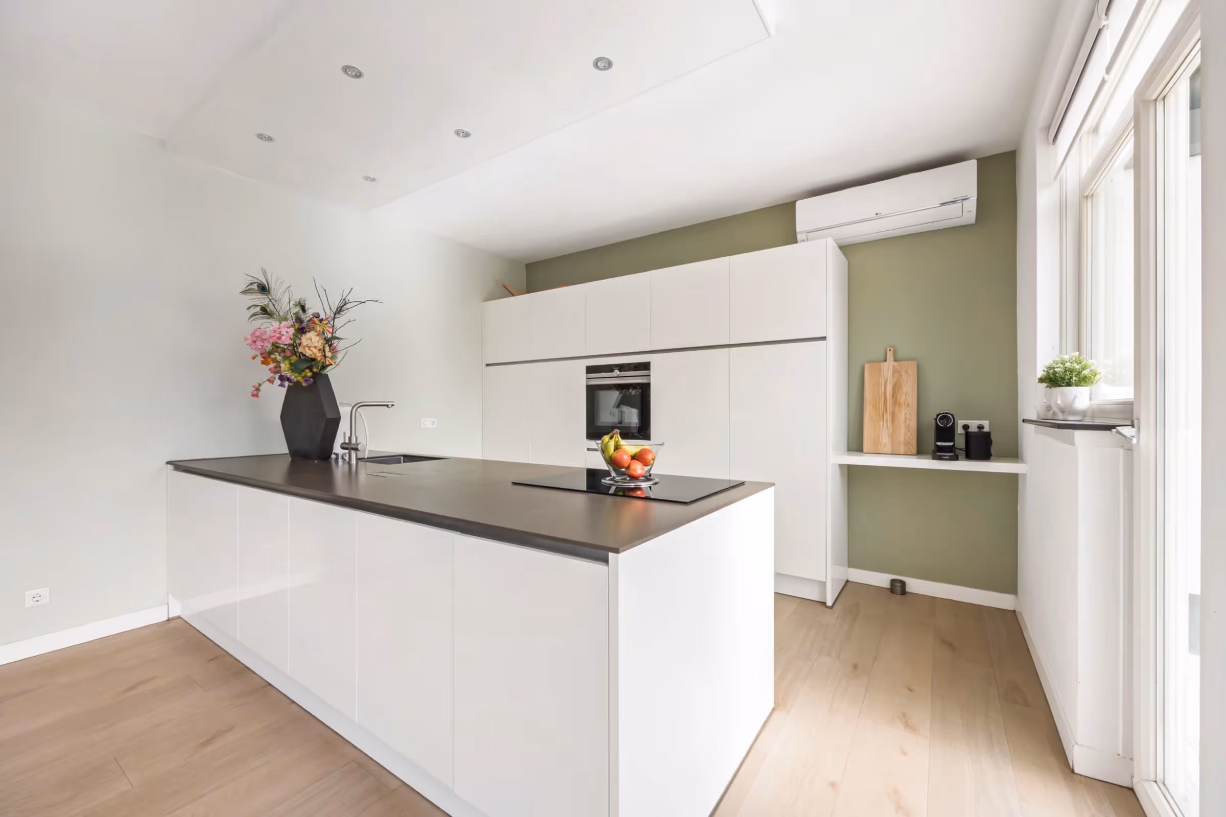 De entreehal van dit stijlvolle woonhuis is licht en open en bevat de moderne meterkast en het gastentoilet. Vanuit de hal is de woonkamer toegankelijk, welke eveneens gekenmerkt wordt door een zee van licht, doordat de woonkamer aan 2 zijden over riante raampartijen en een erker beschikt. De keuken heeft een strakke, witte opstand, met een riant kook- en spoeleiland en veel kastruimte. Voorts is in de keuken de volgende Siemens inbouwapparatuur aanwezig: een koelkast, vriezer, vaatwasser, combi oven en (Bora) inductiekookplaat met afzuiging. De woonkamer en keuken beschikken over vloerverwarming en een airco en door de 2 schuifpuien en tuindeur geniet je van een heerlijk tuincontact.